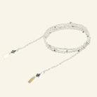 Marie Laure Chamorel's iconic hand-braided open necklace with forçat white Sterling silver chains and twisted white color silk yarn encrusted with tiny crystal beads.