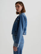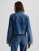 Elevate your denim game with our AG Denim Studded Isa Jacket. Crafted from 12 oz. recycled denim, this jean jacket features a medium indigo stonewash and classic trucker details. The silver nailhead accents add a touch of edgy glam to the straight, cropped fit and bell-shaped sleeves. Make a statement while being environmentally conscious.