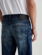 The five-pocket pair features an AG-ed™ medium indigo wash with heavy fading, worn edges, and a vintage tint for authentic lived-in character.