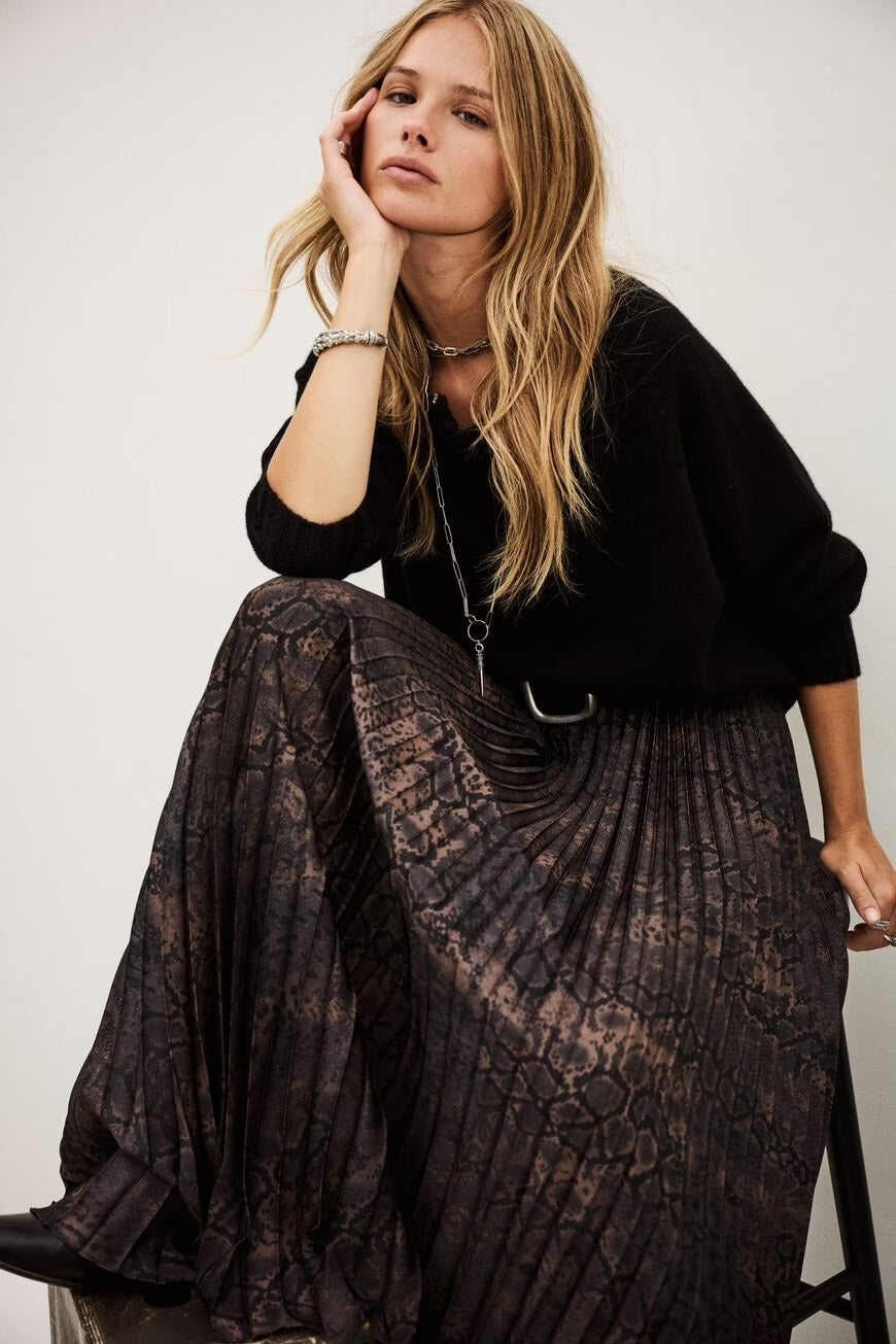 Elevate your wardrobe with the Bash Paris Spice Skirt in Marron. This pleated maxi skirt combines timeless elegance with a rich, warm hue, perfect for sophisticated styling. Its flowing silhouette offers graceful movement, making it an ideal choice for both day and evening occasions. Embrace refined comfort and effortless chic with this versatile piece.