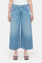 Crafted from authentic rigid denim (10 oz.) made from pure cotton: 5-pocket jeans in a wide fit with a mid-rise waist and wide, cropped legs. A modern take on a vintage wash features gentle strikes and whiskers, achieved through specialised techniques and hand-finishing, making each garment unique. Created by the Closed denim experts in Italy.