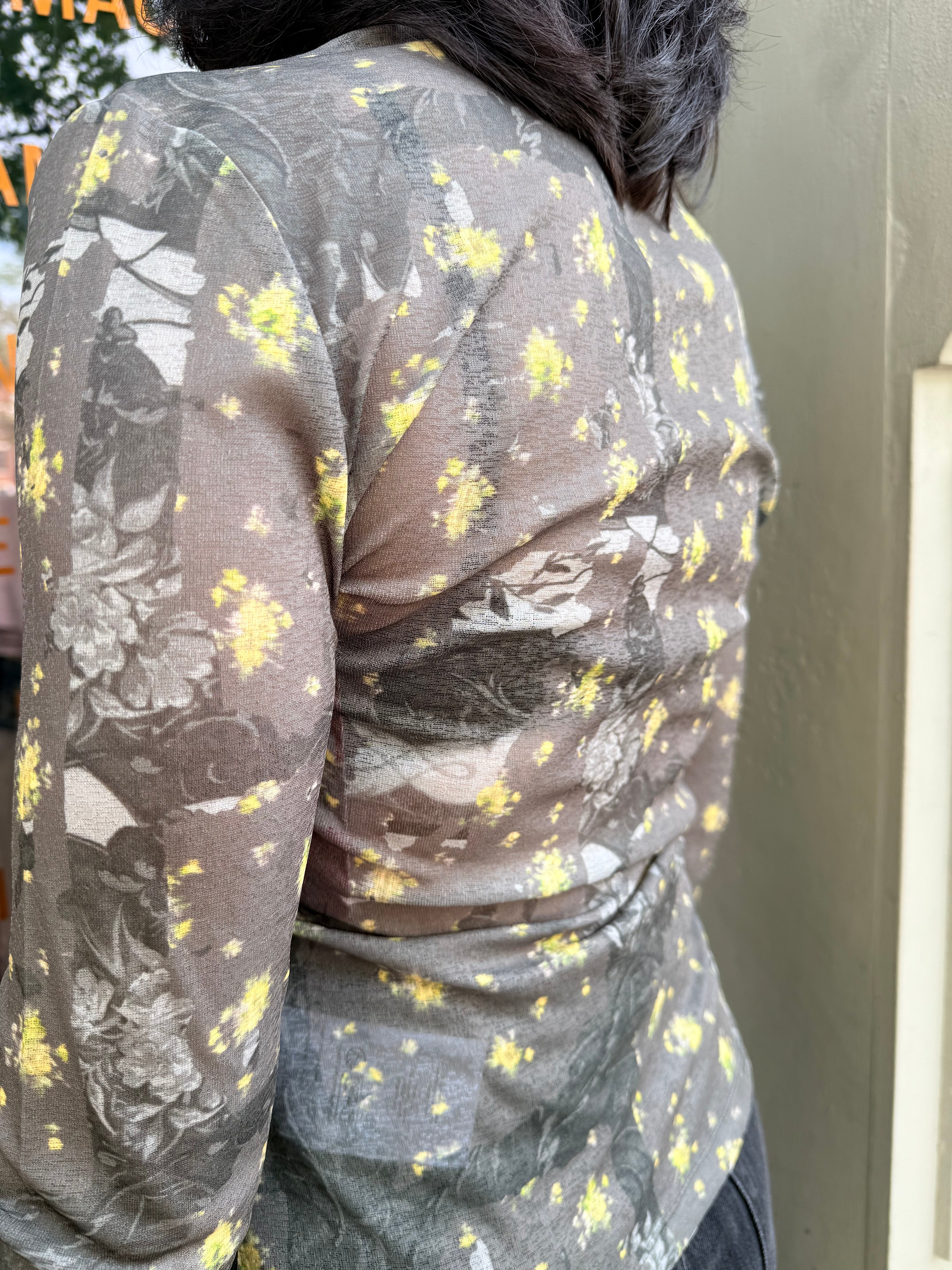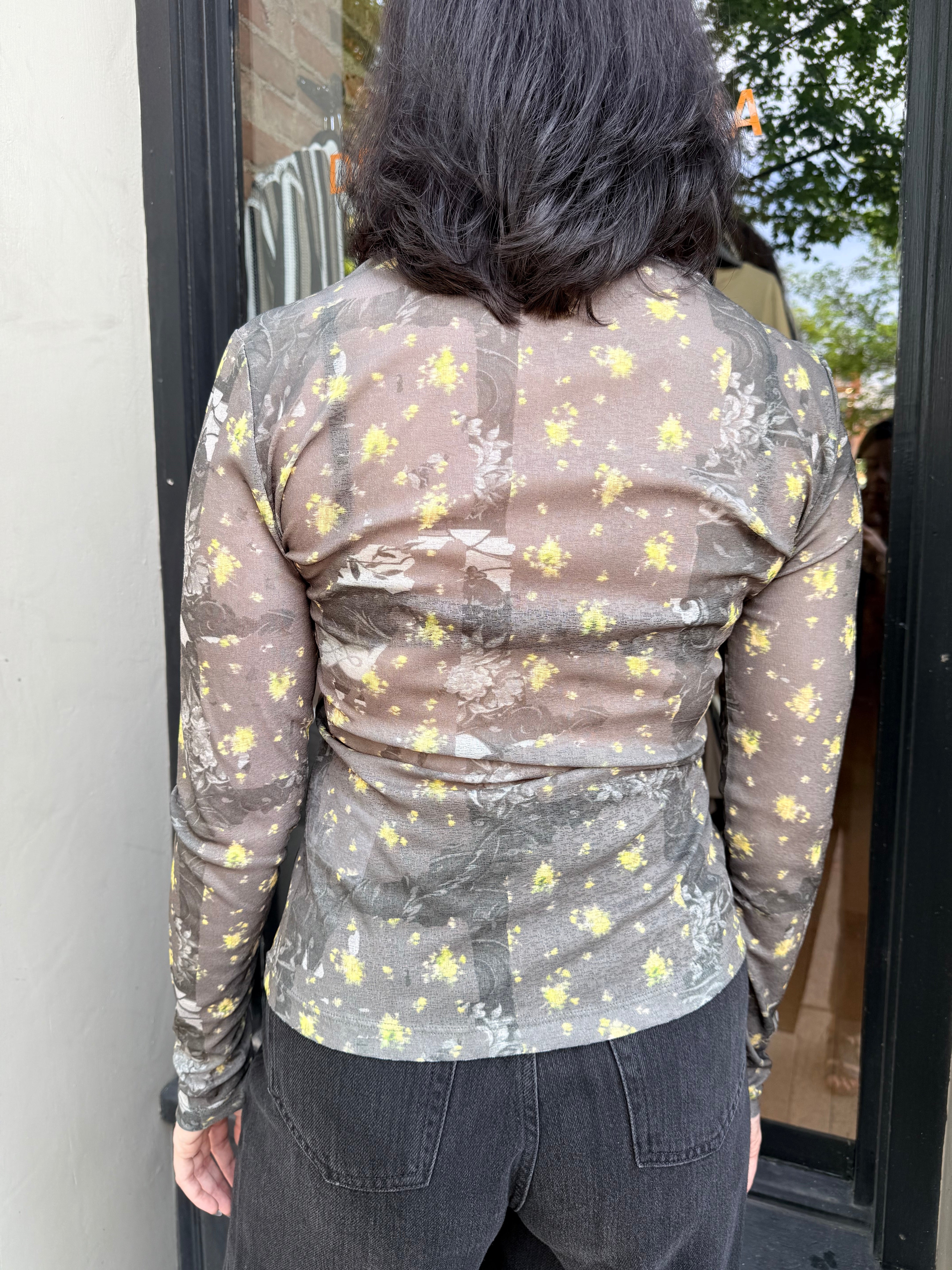GANNI Printed Marl Mesh Long Sleeve Top - Black Sand