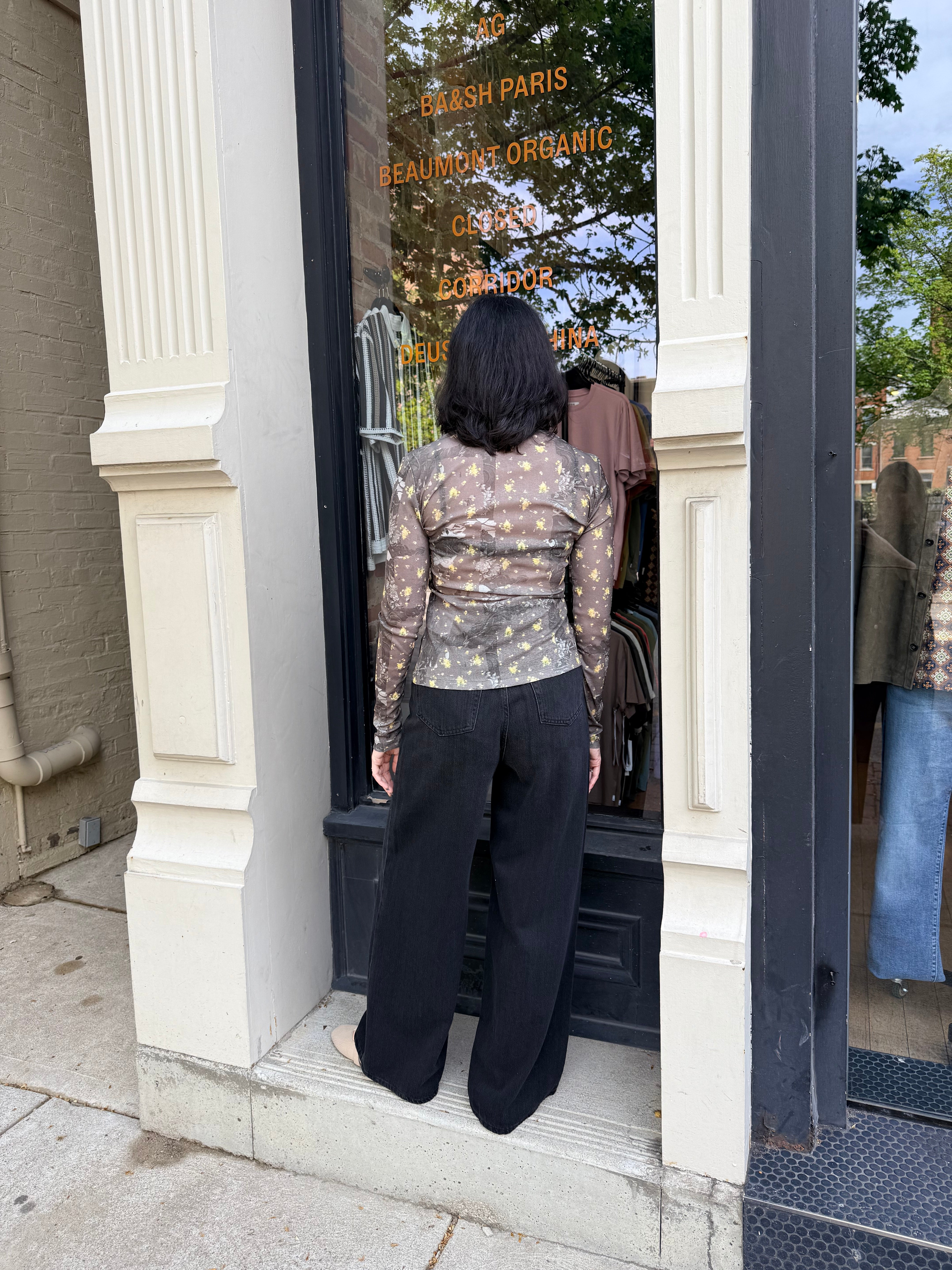 This top features a round neckline and long sleeves.