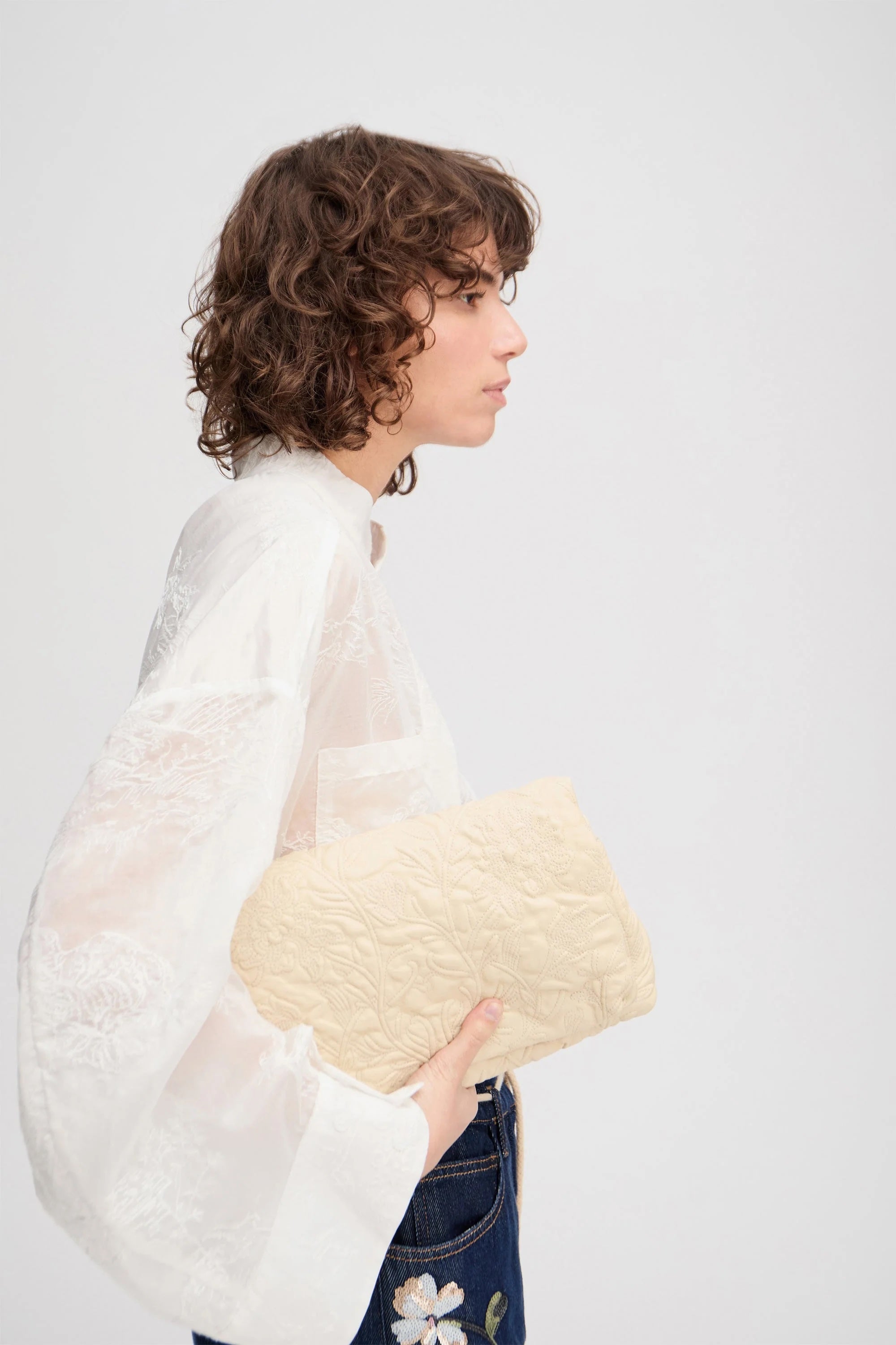The Munthe Foluke Clutch in beige is a stunning accessory crafted from high-quality leather. Its intricate embossed allover flower pattern adds a touch of elegance to any outfit. Complete with a detachable shoulder strap, this versatile bag is perfect for any occasion.