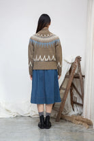 The Hawthorne is a funnel neck jumper with a modern Fairisle pattern on the body and shoulders.
