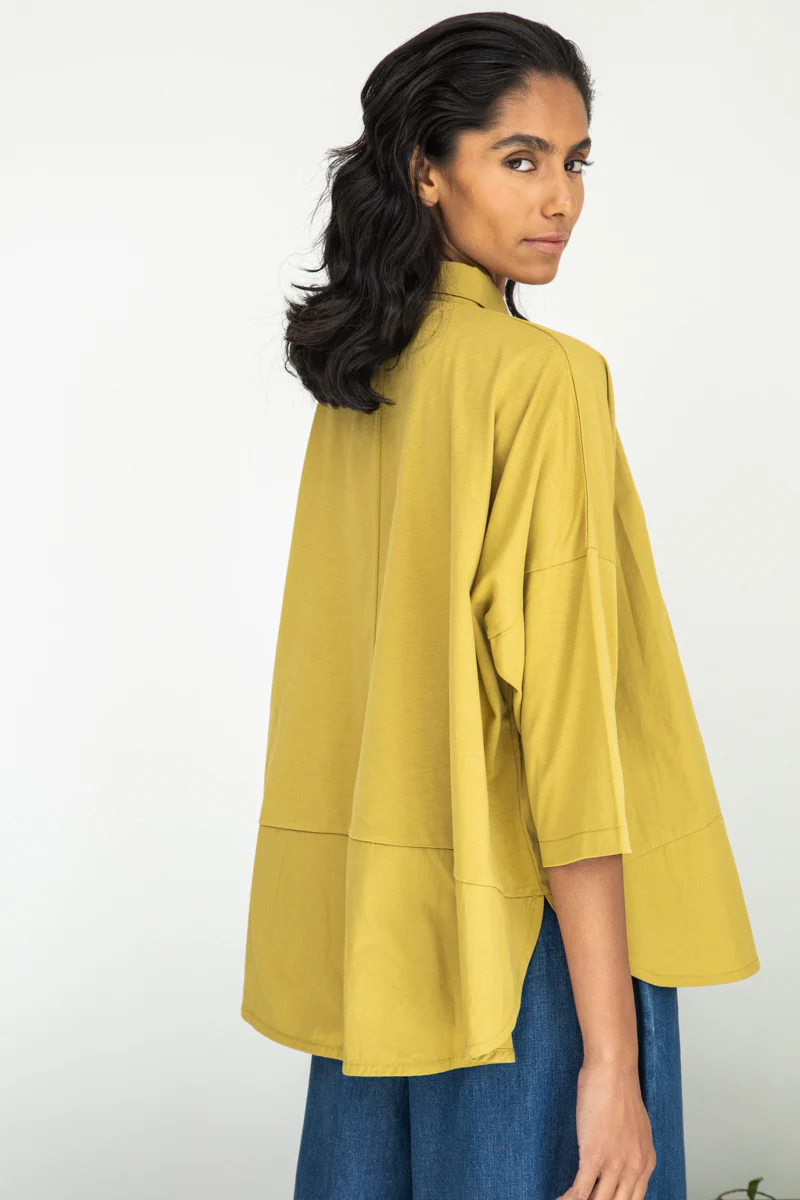 Stay comfortable and stylish with the Beaumont Organic Lissie Top in bright olive. This batwing style shirt features a covered button down front placket and curved staggered hem. Crafted from soft poplin and jersey cotton, it's perfect for any occasion. Made ethically in Portugal from 100% organic cotton and sustainable corzo buttons. Machine washable.