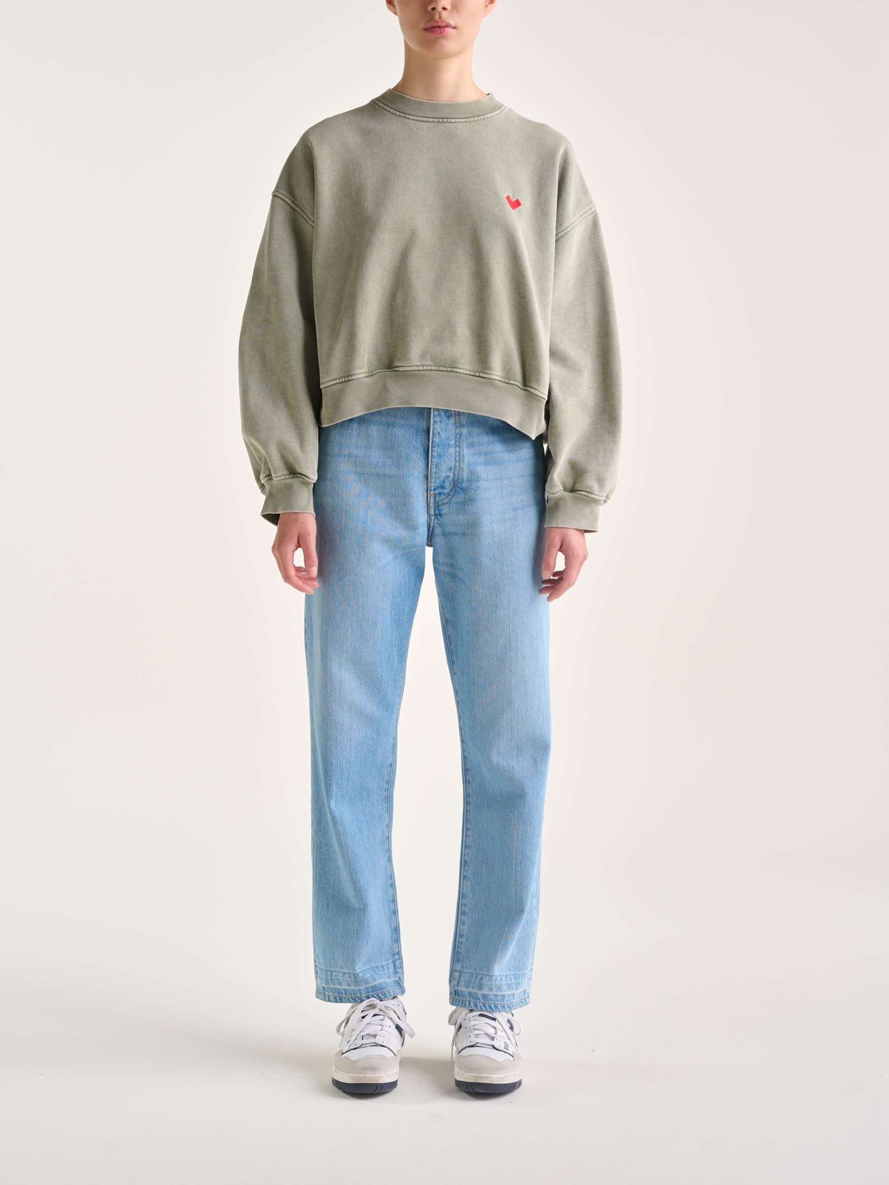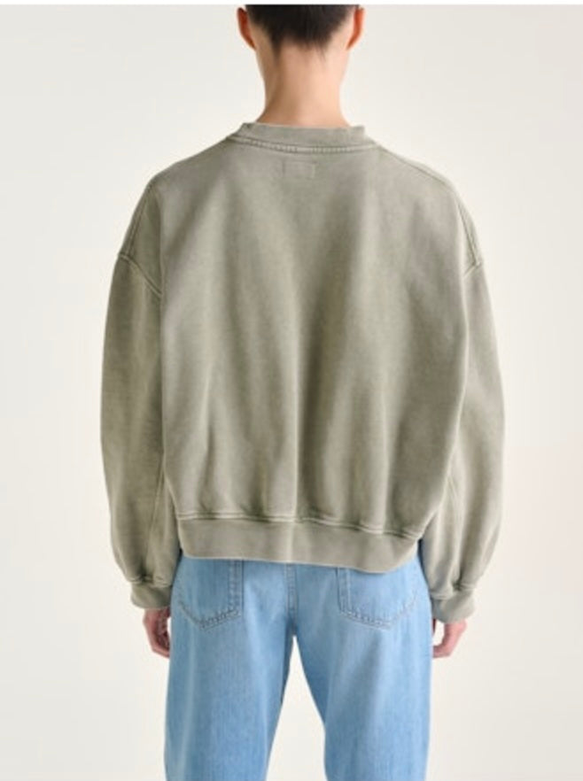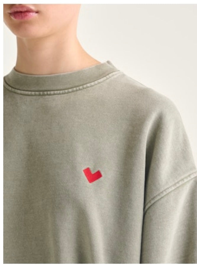 Elevate your casual wardrobe with the Bellerose Fancy Sweatshirt featuring a unique red logo on the chest. This drop shoulder sweatshirt offers a slouchy, waist length fit for a cool and relaxed look. Perfect for any casual occasion.