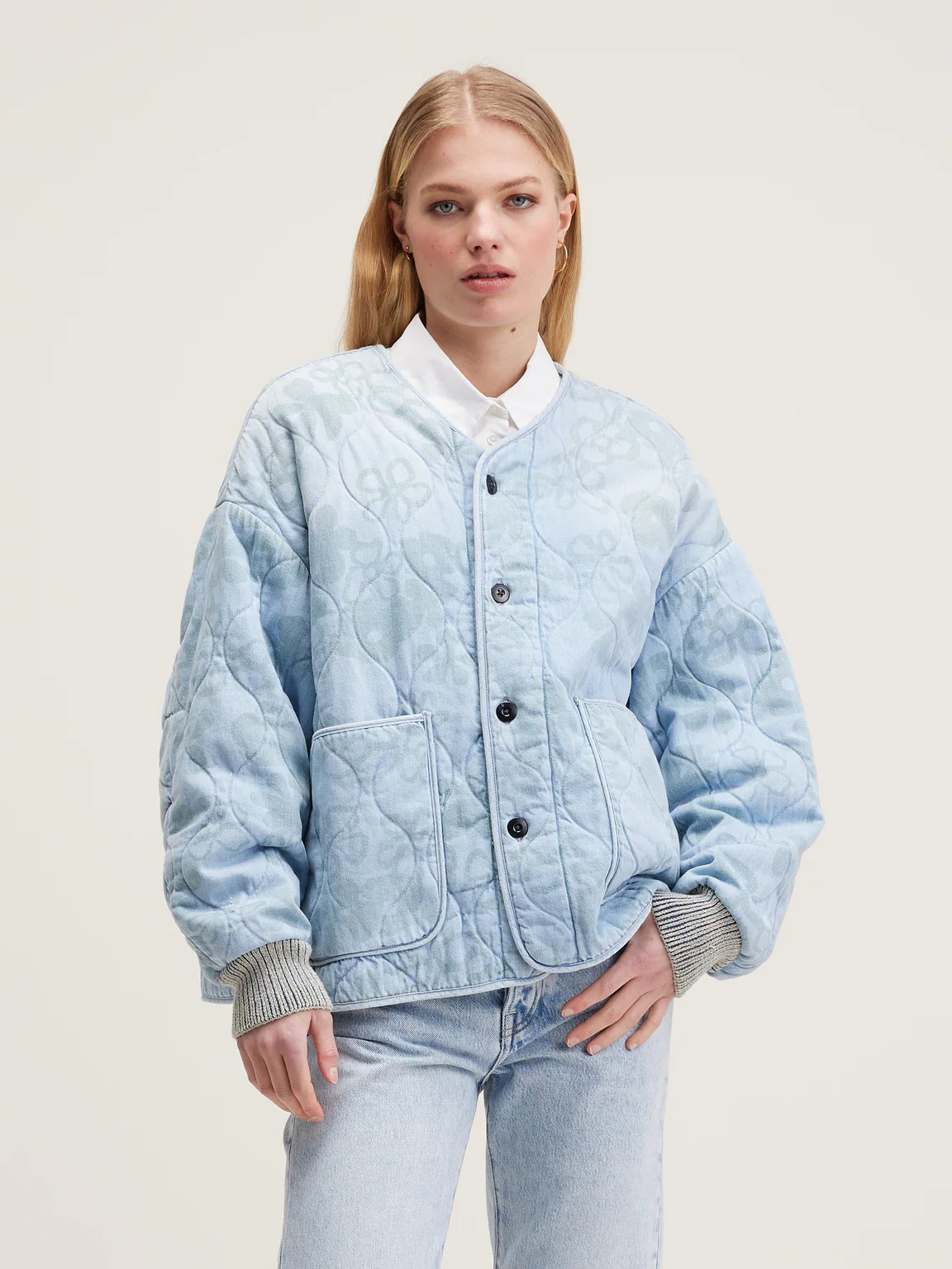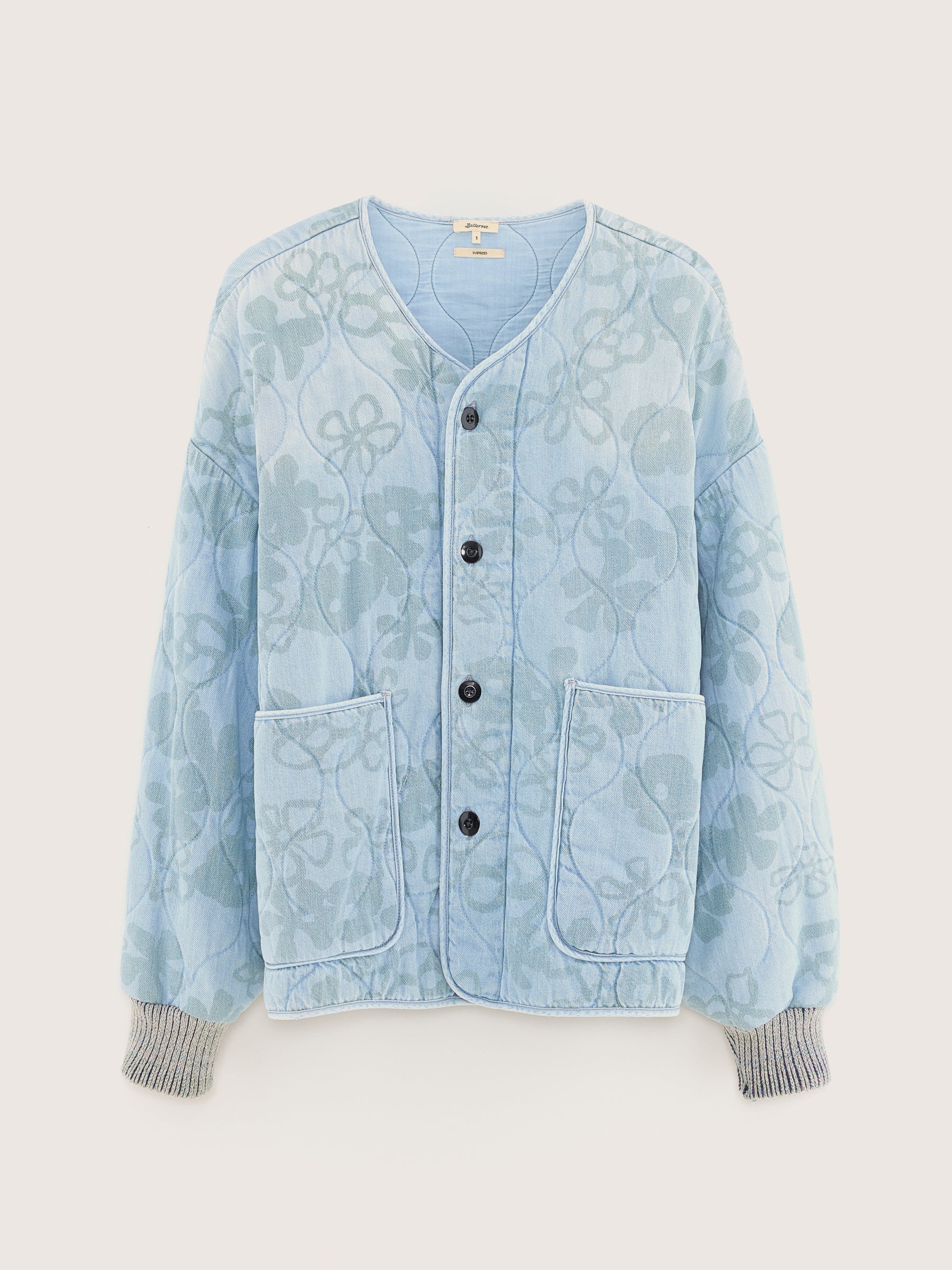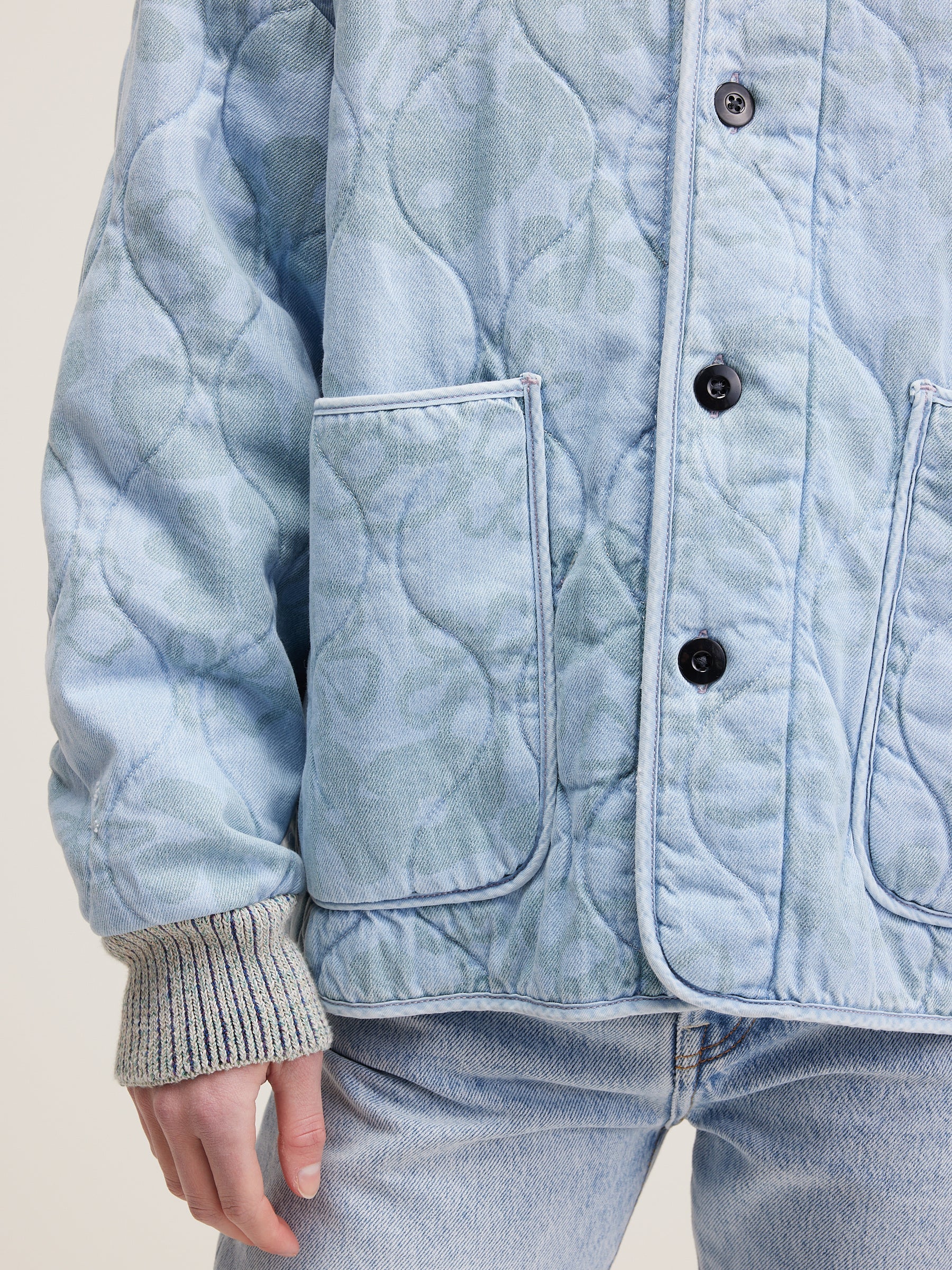 Oversized liner-style jacket in cotton denim with naive tone-on-tone floral prints.