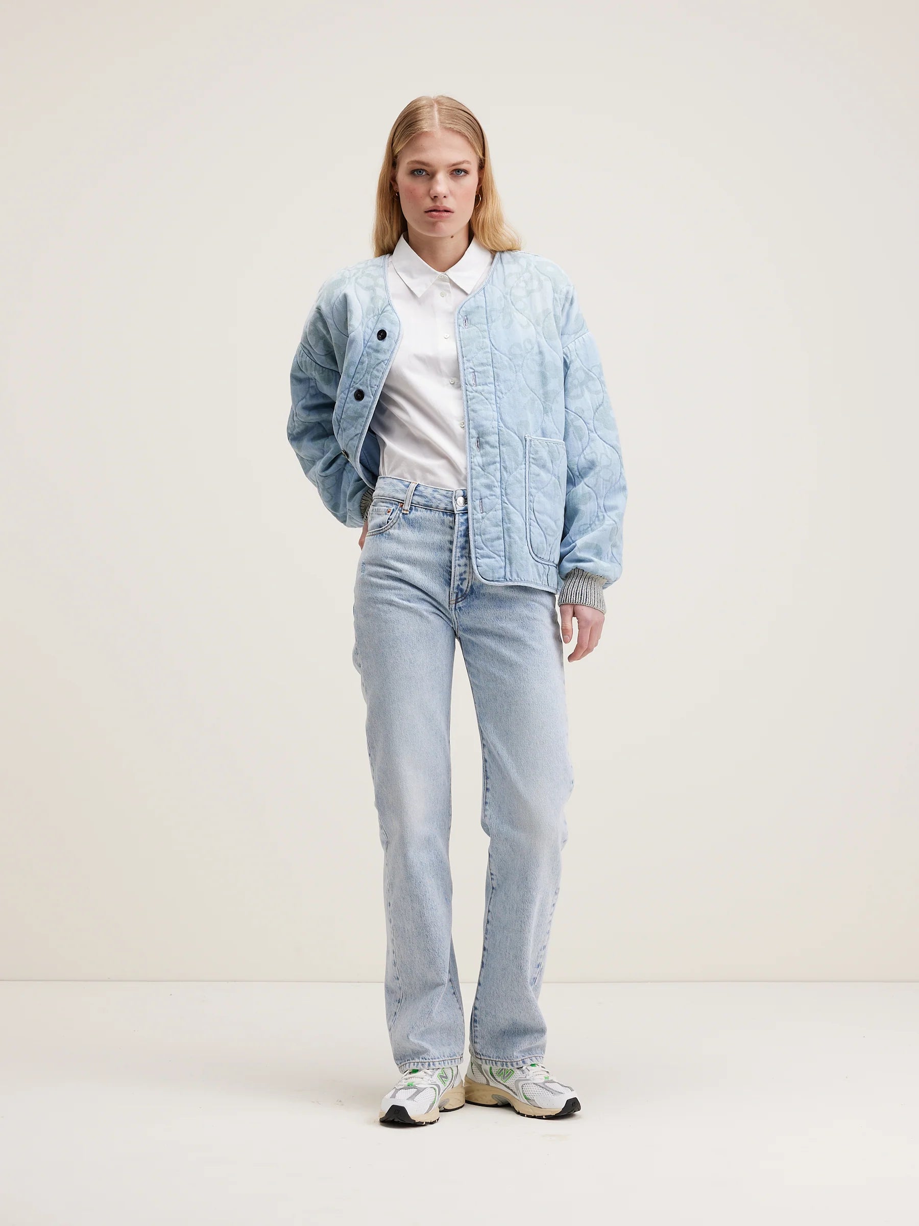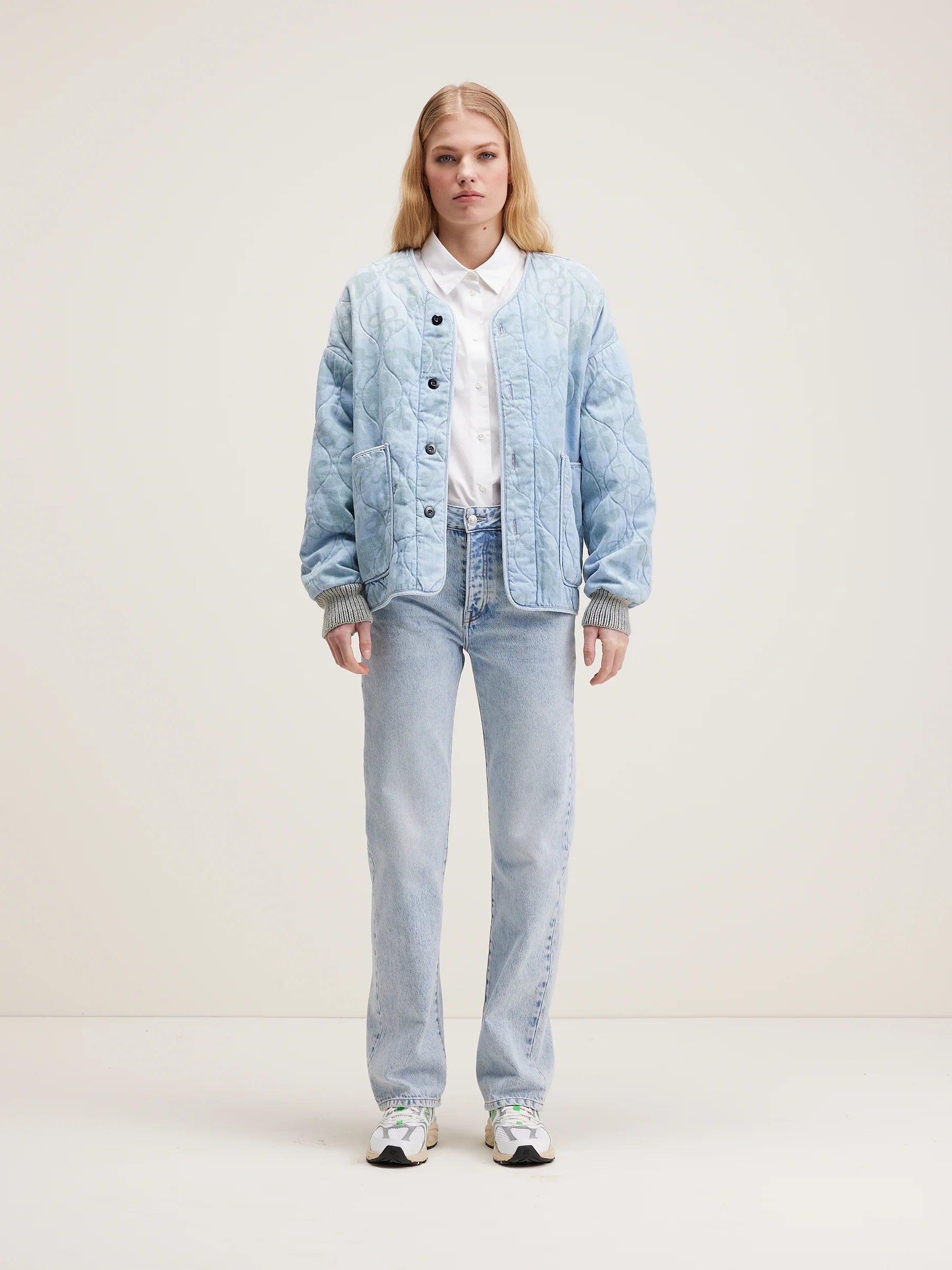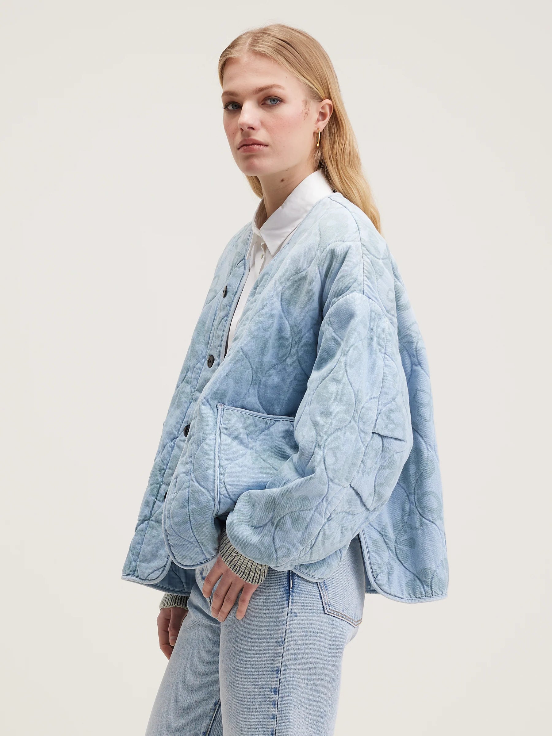 Oversized liner-style jacket in cotton denim with naive tone-on-tone floral prints.