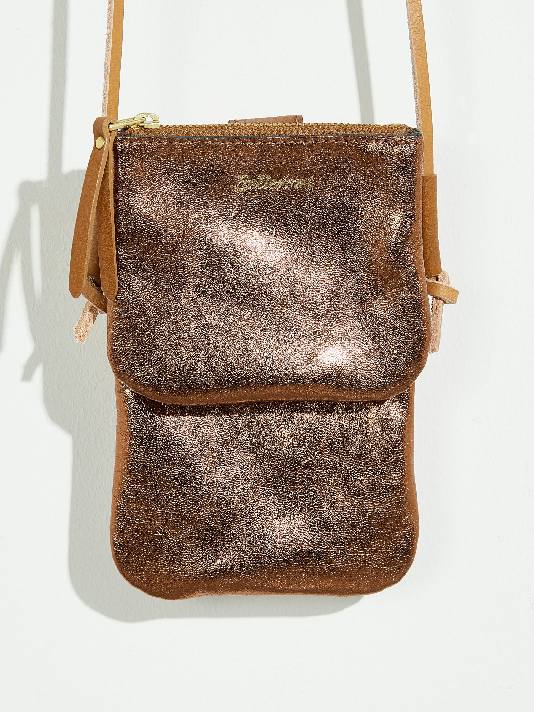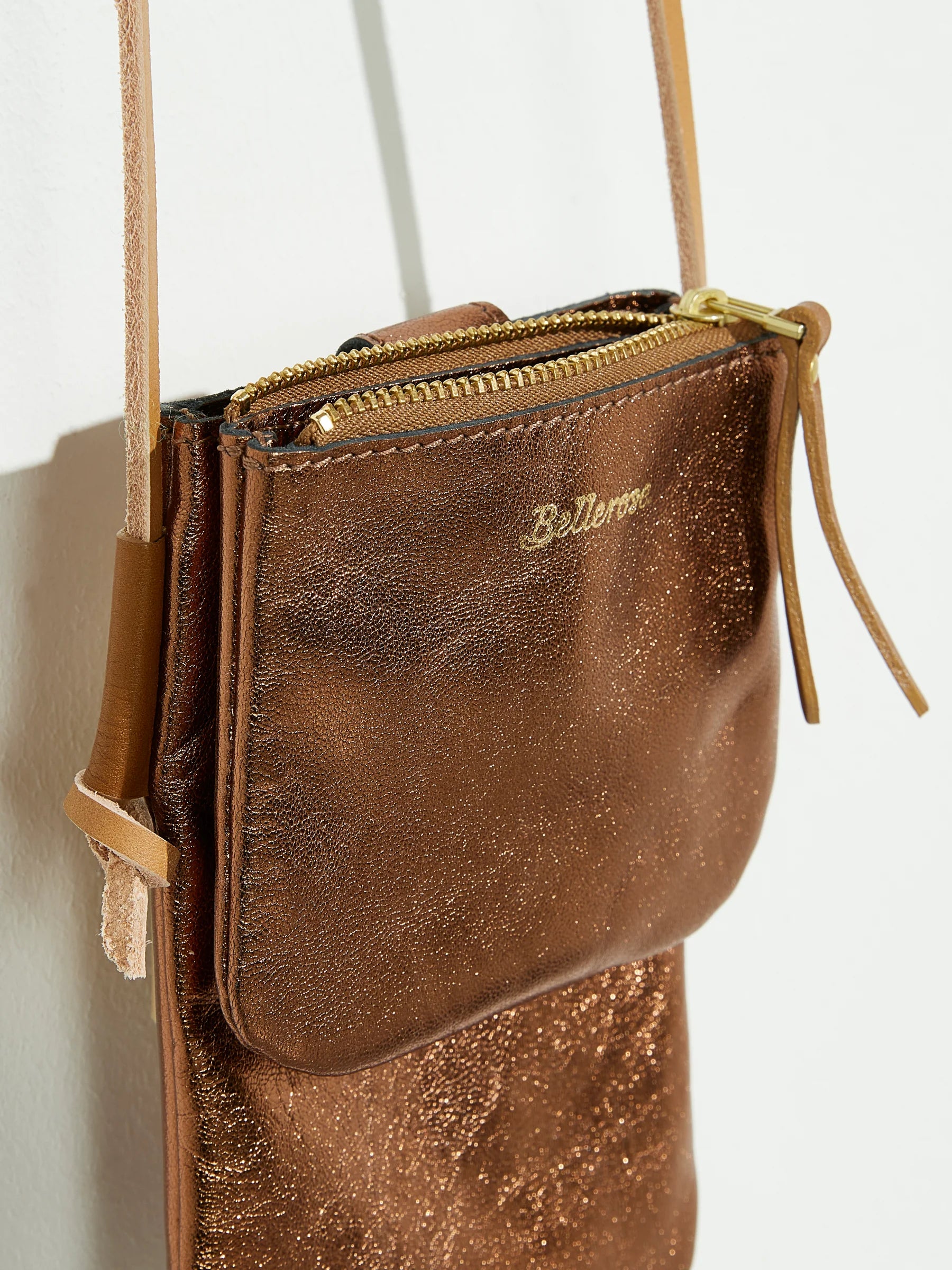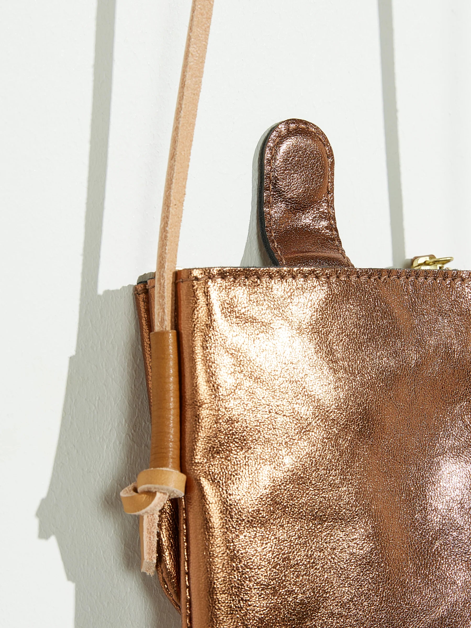 The perfect bag to tote your essentials. The Sidt is made from metallic tone leather with a main compartment to lodge your phone and a zipped pocket for your cards and keys. The self-tie adjustable strap lets you keep it as close to your heart as needed.