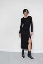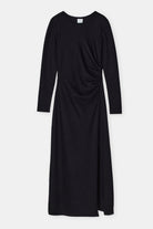 Expertly crafted from luxurious Portuguese wool jersey, this slim fit dress exudes sophistication and comfort. The fixed draping at the waist accentuates your figure, while the high leg slit adds a touch of elegance. With a soft and light feel, this black dress is perfect for any occasion.