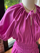 Expertly crafted with sateen cotton, the Devotion Rania Midi Dress in striking fuchsia offers a lightweight, breathable design. The elastic smocking at the waist is flattering and the tie string neckline provides a customizable fit and stylish touch. Elevate your wardrobe with this statement piece.