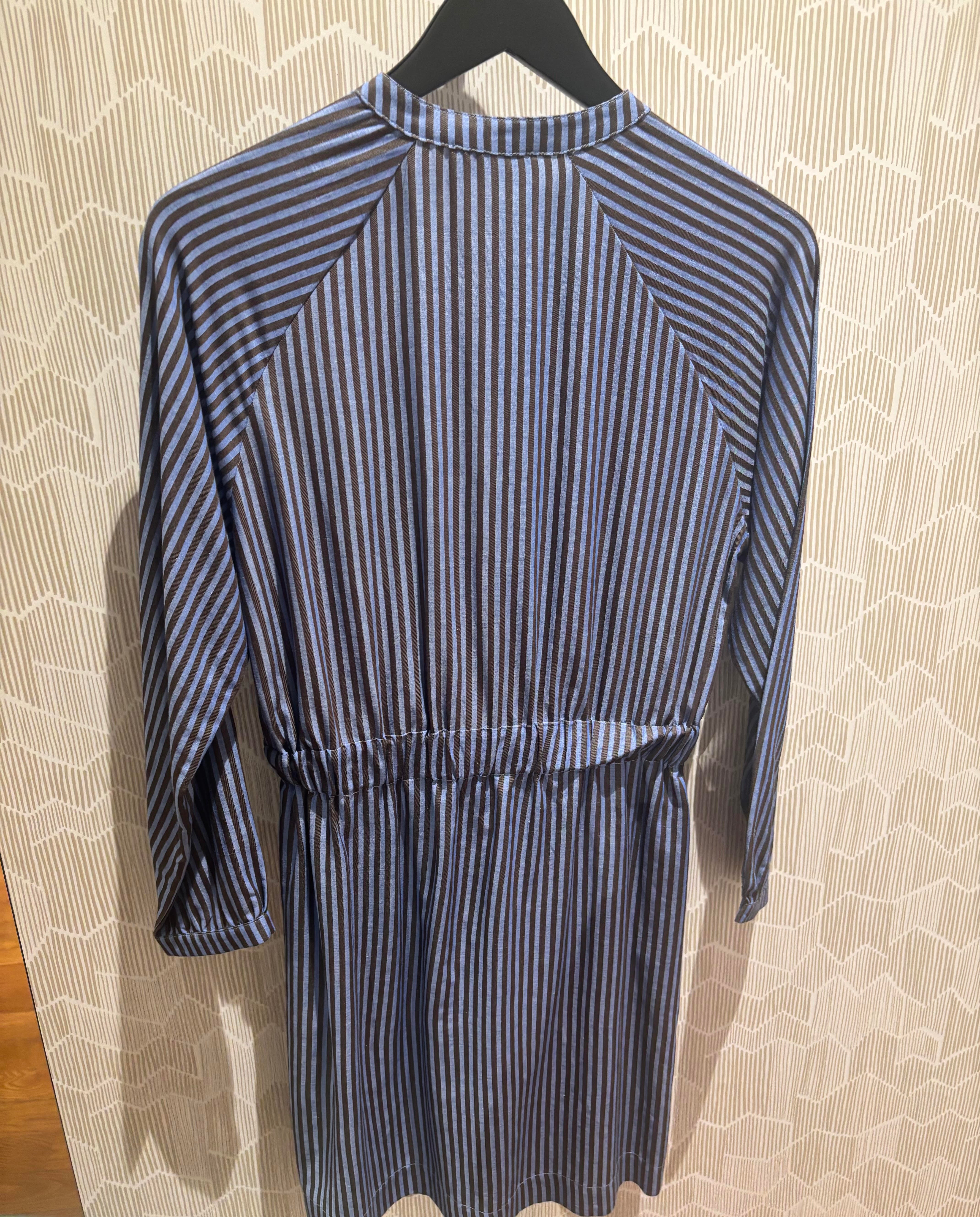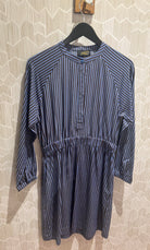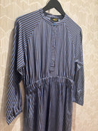 Introducing Le Mont St. Michel, the epitome of elegance and comfort. This long-sleeved Romance dress is crafted with a cotton-blend fabric, featuring a Tunisian collar and hammered armholes. The button placket and elasticated waistband create a play of gathers, enhancing the slimming stripes. With its light and naturally soft fabric, this dress provides luxurious comfort all day long.