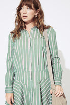 Introducing the Saylor Naeem Shirtdress in Juniper, a versatile addition to your wardrobe. This striped shirt dress is made with crisp 100% cotton, providing a comfortable and breathable fit. Featuring a button-up design and intricate detailing around the skirt, this dress is both stylish and practical. Perfect for any occasion, this dress offers both sophistication and comfort.