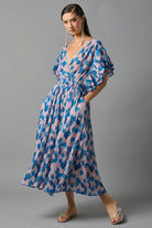 Made with a blend of 65% Tencel, 20% Nylon, and 15% Linen, this dress offers a soft and breathable feel. The deep v-neck in the front and back, along with ruffled short sleeves, adds a touch of femininity. Perfect for any occasion with its mid-calf length and beautiful blue and pink floral Dufy-esque print.