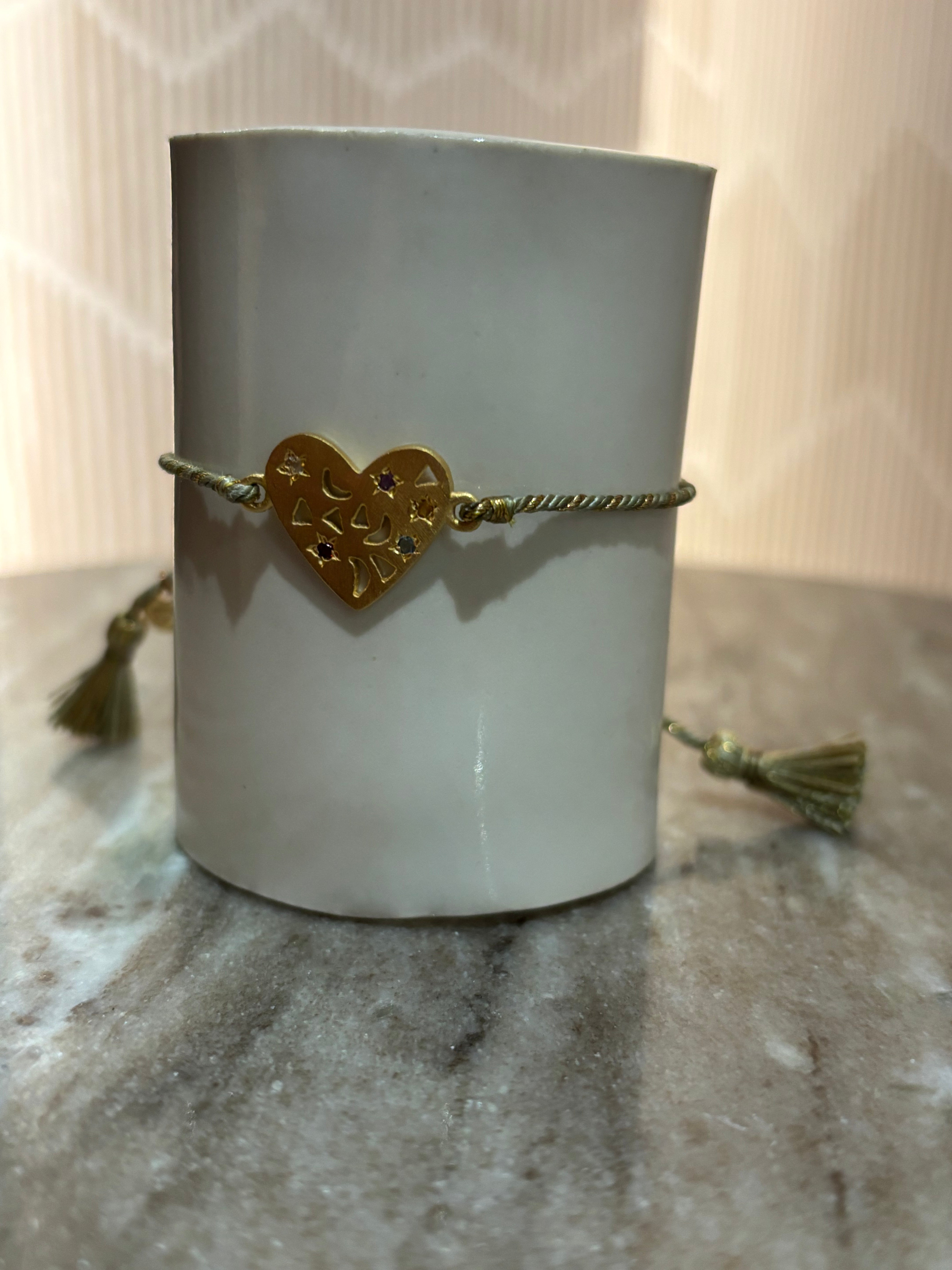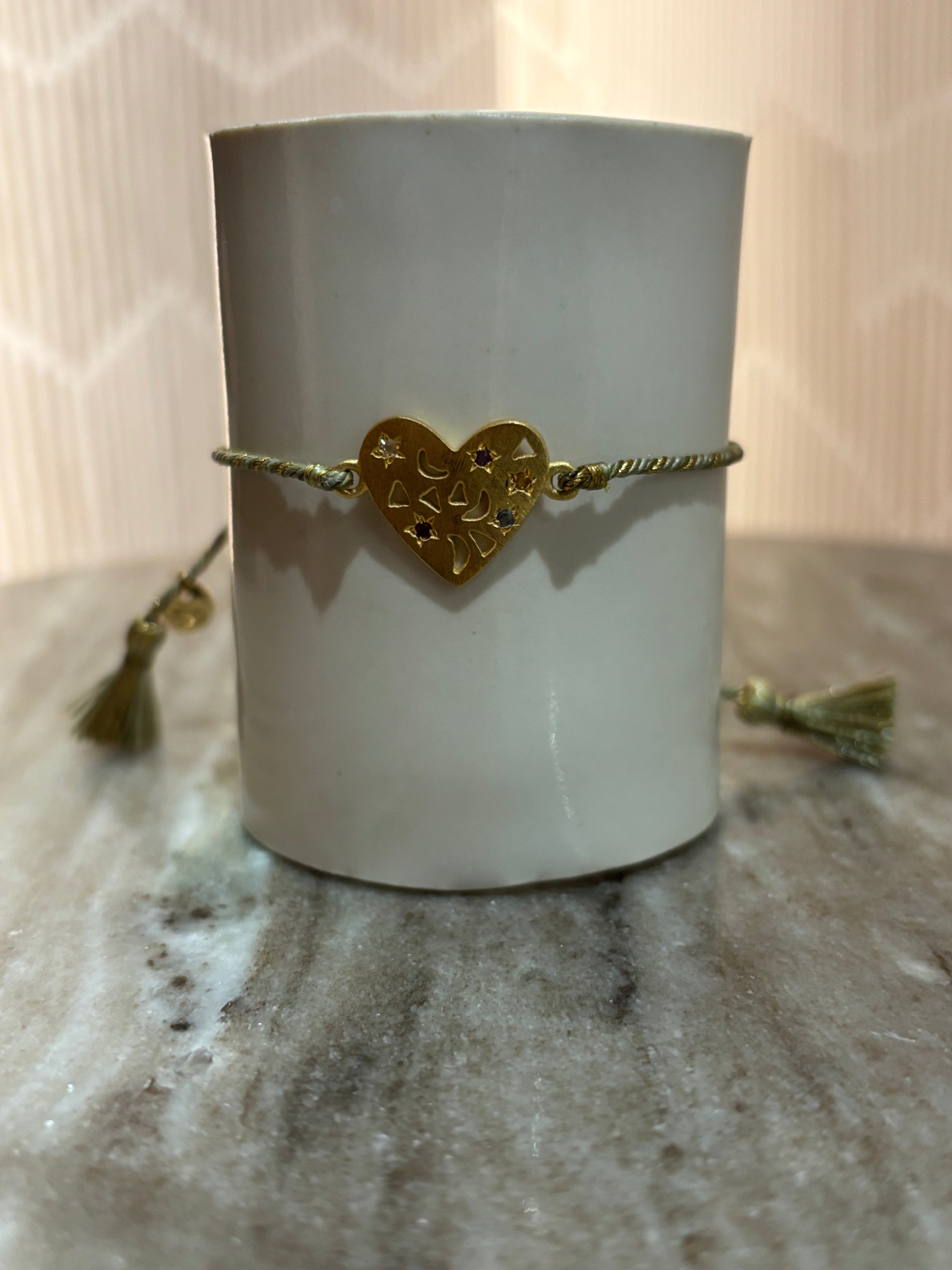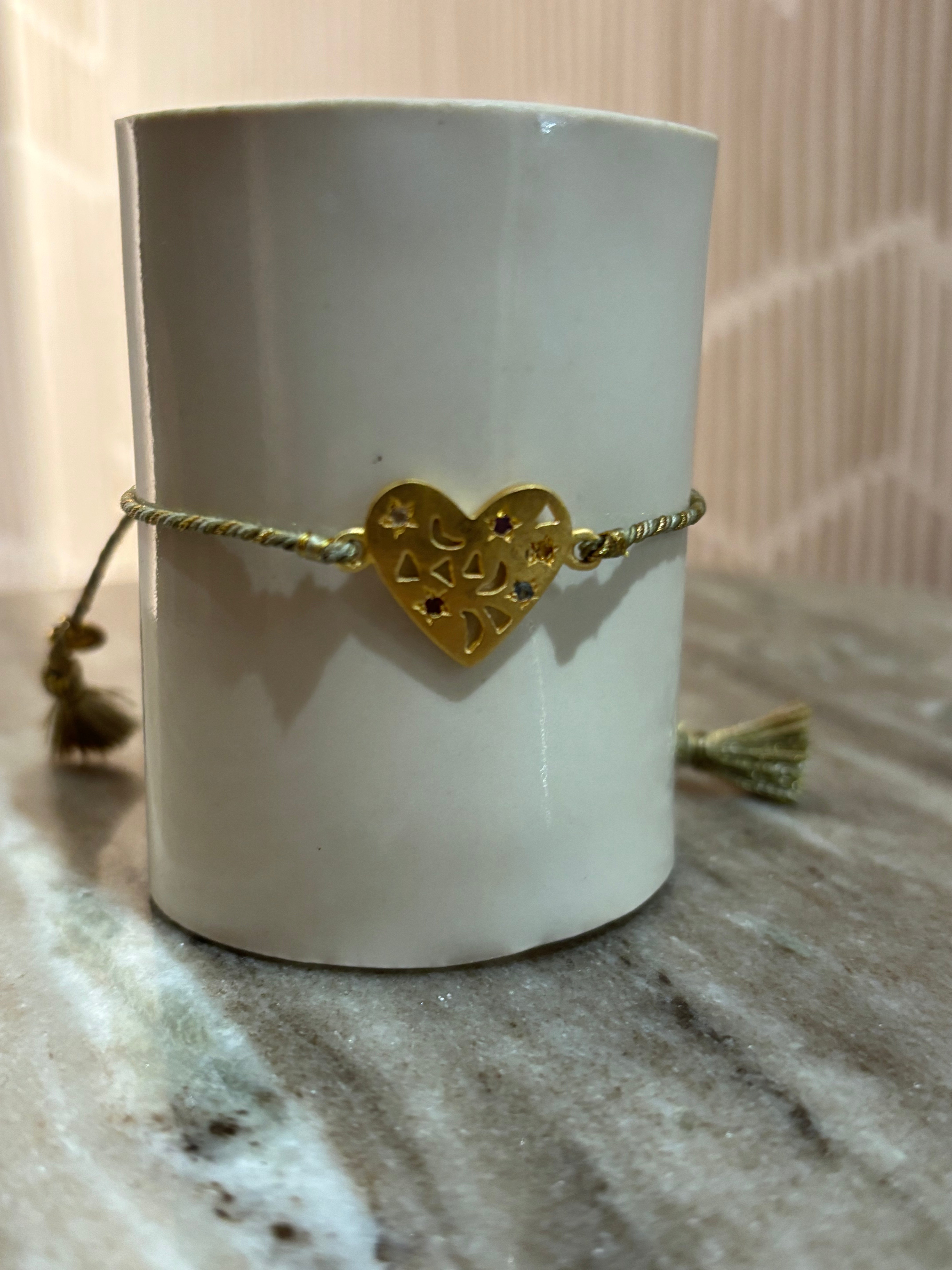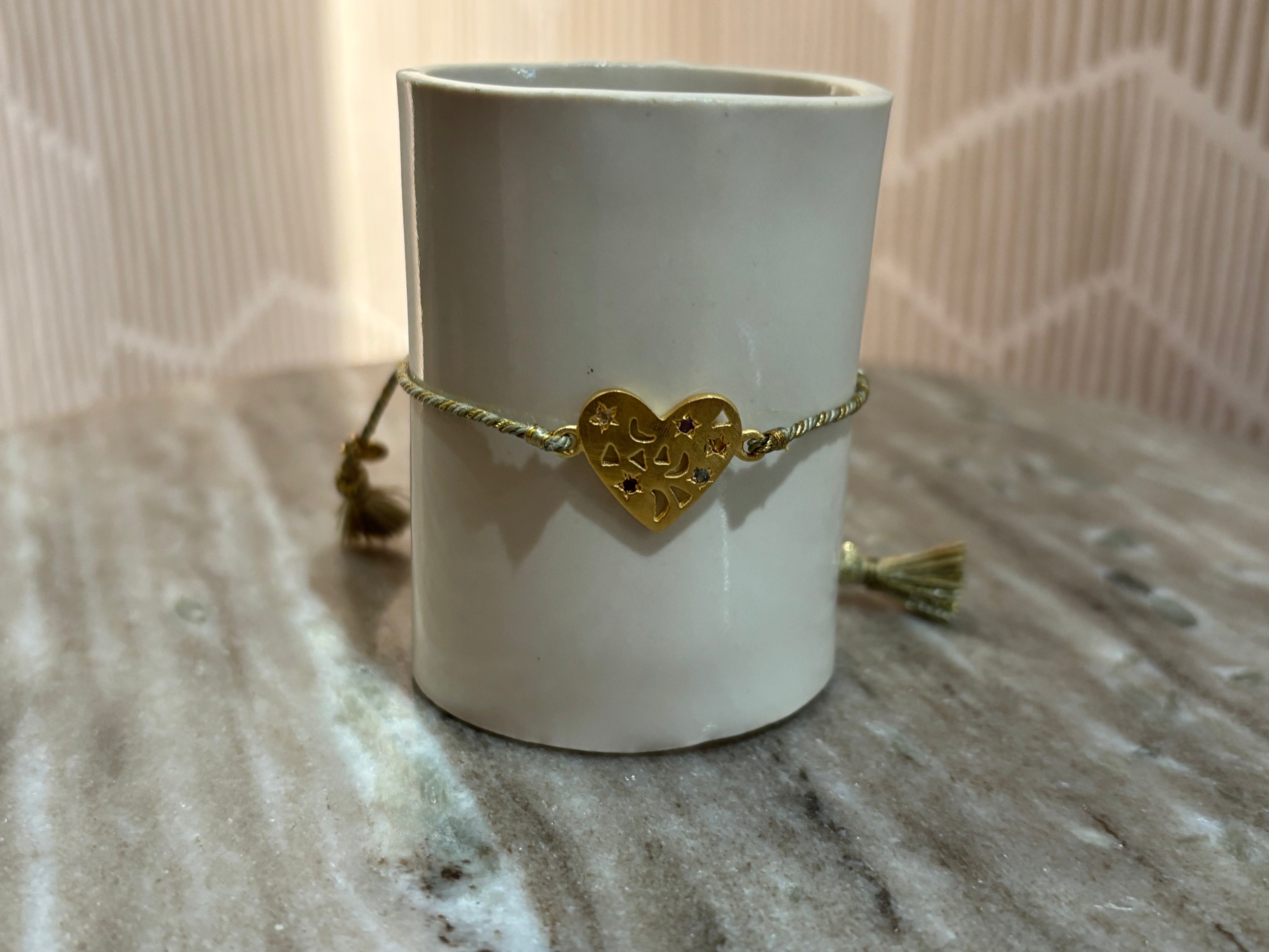 Elevate your ensemble with the Golden Hour Jaan Bracelet, a sophisticated blend of artistry and elegance. This unique handcrafted piece features a delicate gold-plated heart adorned with multi-colored stones, intertwined with shimmering lurex thread. Designed with adjustable sliding knots for a perfect fit, it offers subtle water resistance—ideal for everyday wear while avoiding exposure to perfumes or washing. A timeless accessory that captures the radiant beauty of golden hour, perfect for those who appreciate refined, meaningful jewelry.
