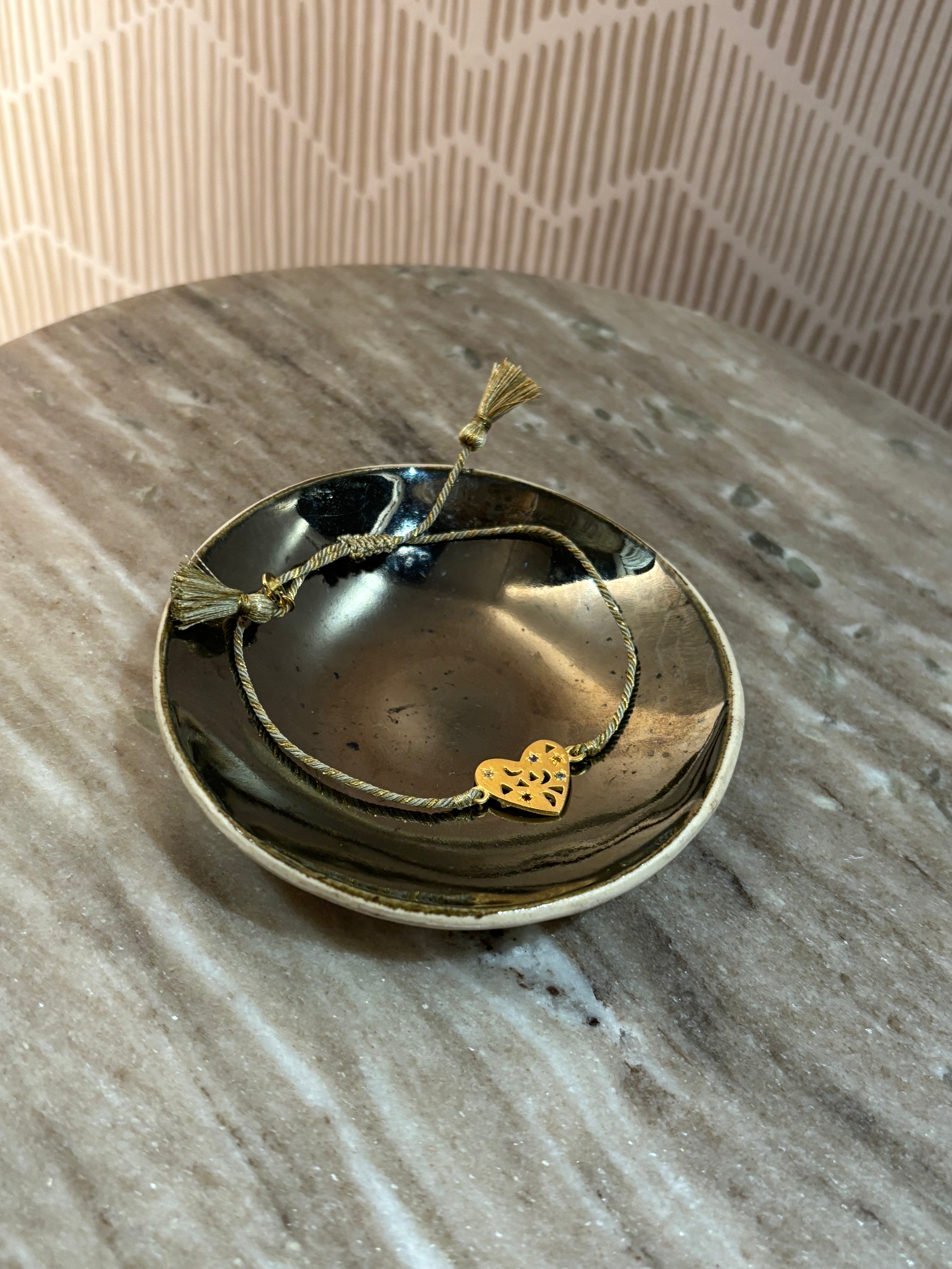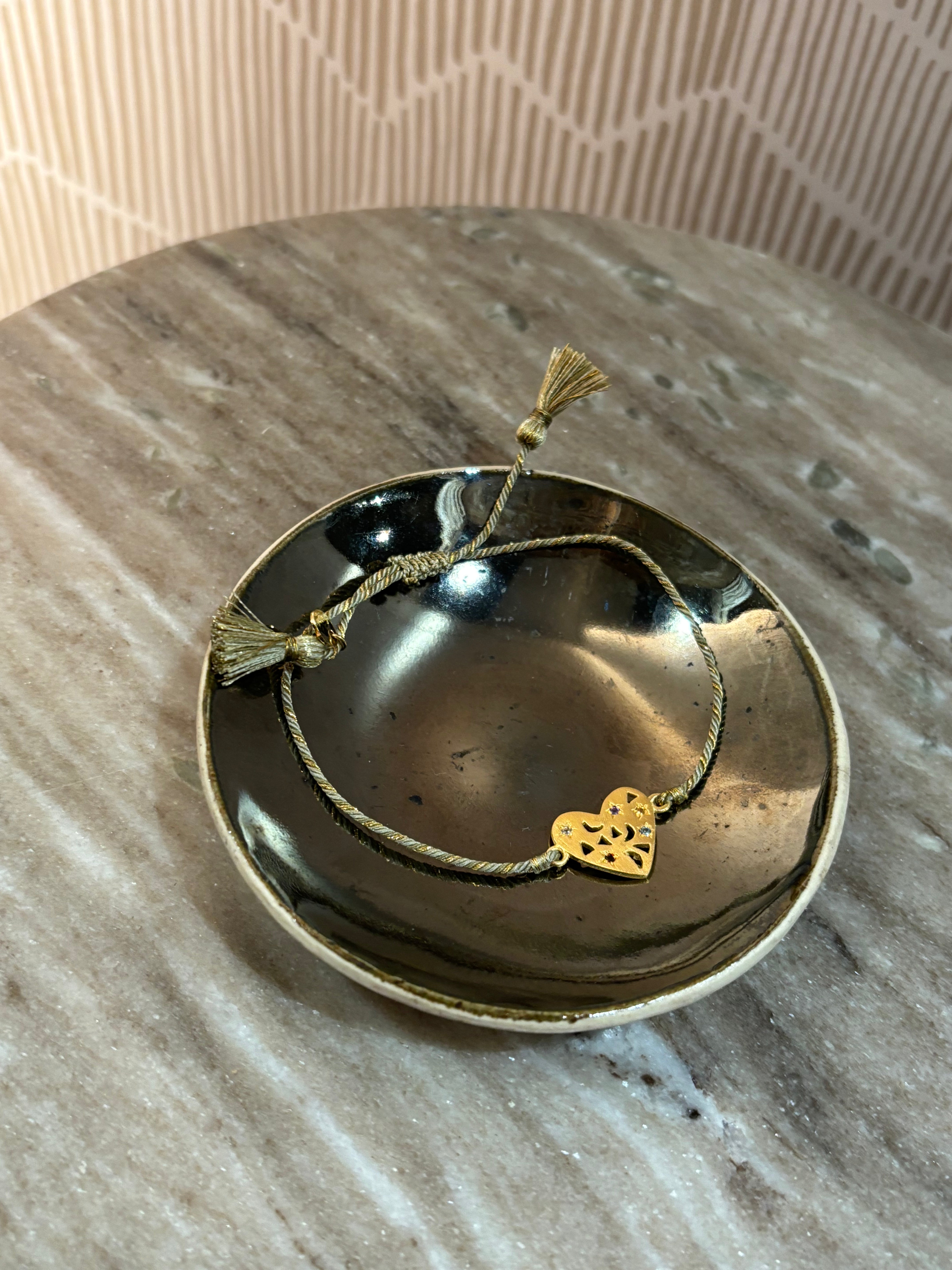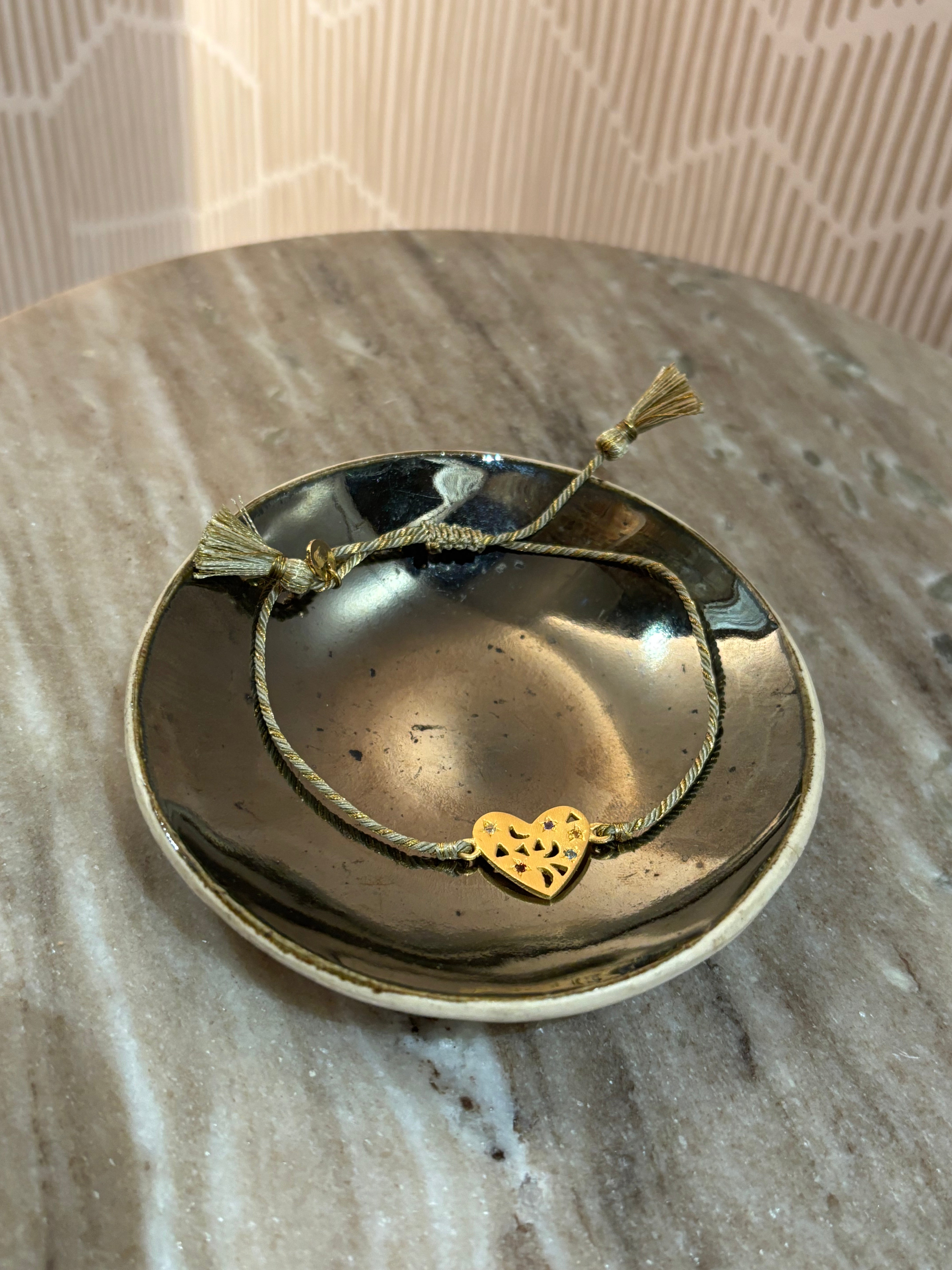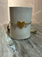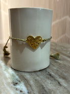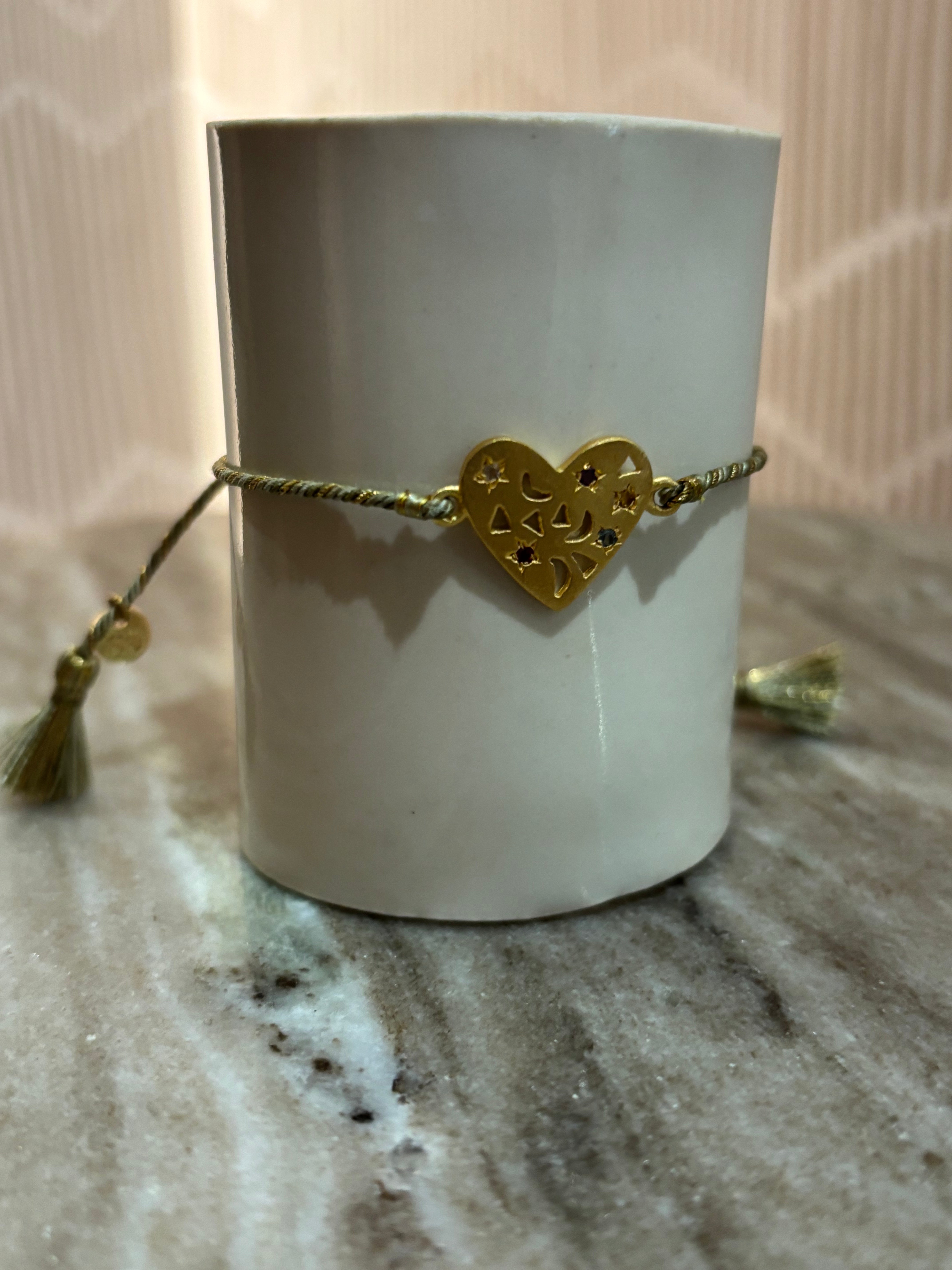 Elevate your ensemble with the Golden Hour Jaan Bracelet, a sophisticated blend of artistry and elegance. This unique handcrafted piece features a delicate gold-plated heart adorned with multi-colored stones, intertwined with shimmering lurex thread. Designed with adjustable sliding knots for a perfect fit, it offers subtle water resistance—ideal for everyday wear while avoiding exposure to perfumes or washing. A timeless accessory that captures the radiant beauty of golden hour, perfect for those who appreciate refined, meaningful jewelry.