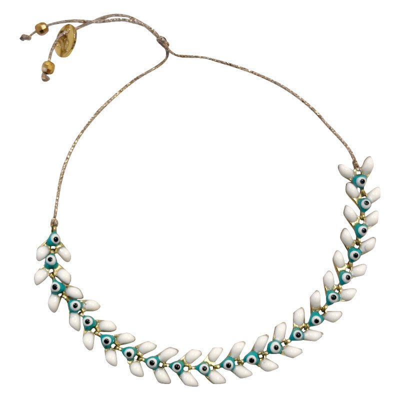 Elevate your ensemble with the Golden Hour Leopold Bracelet, a refined accessory featuring delicate white gemstones surrounding enameled turquoise eyes, all joined by shimmering taupe lurex wire. Crafted by hand, it showcases a 9 cm enameled brass chain with an adjustable slip knot for a perfect, comfortable fit. This unique piece embodies understated elegance, ideal for those who appreciate sophisticated, artisanal jewelry.