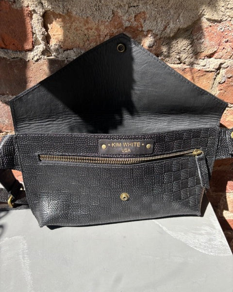 Kim’s belts and bags are all made in the USA with the finest craftsmanship, made by real people, one by one. This specialty line of leather goods is made to last, with attention paid to the finest quality craftsmanship. The buckles Kim uses on her belt line are specially cast uniquely for Kim White.