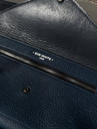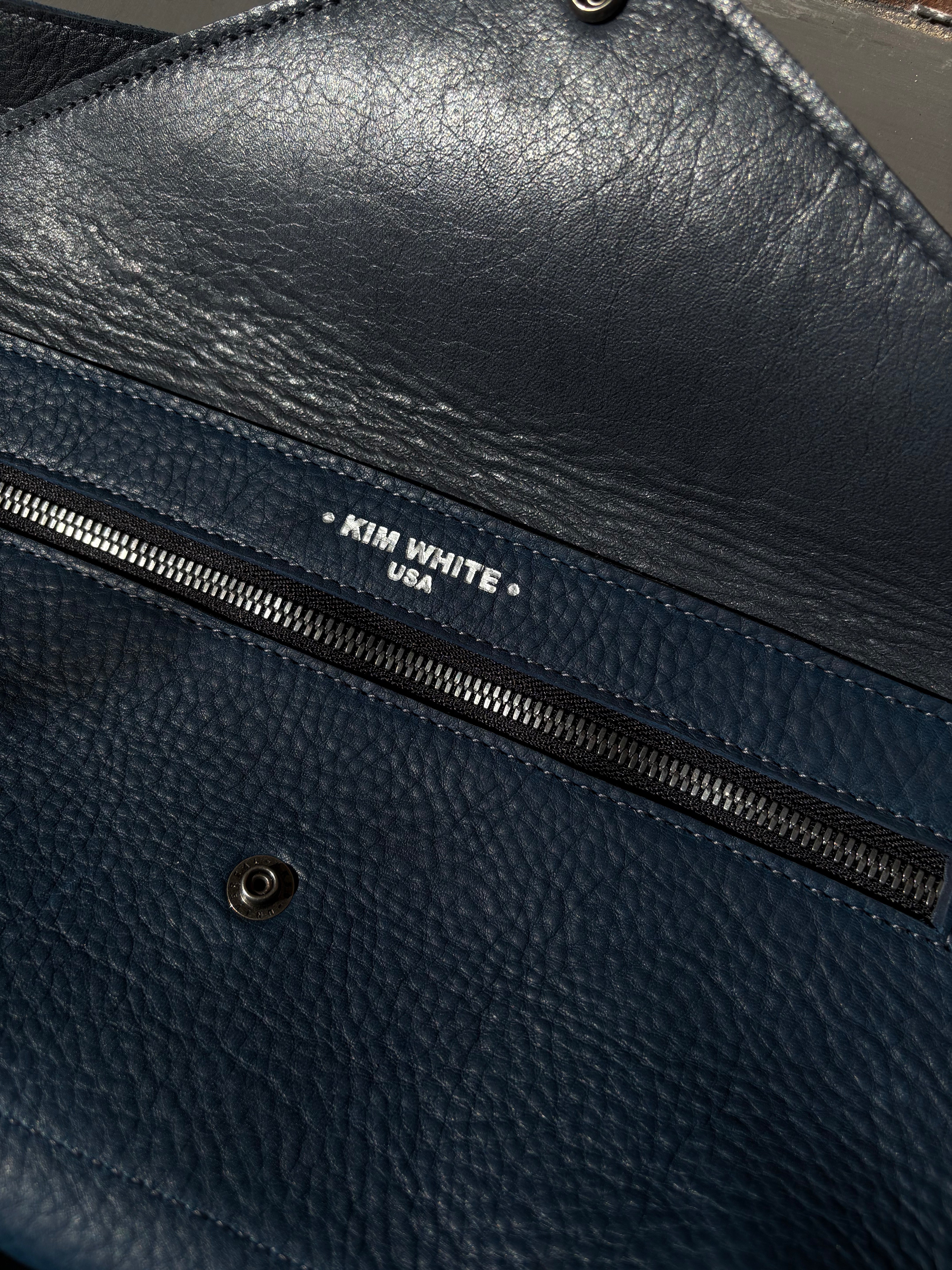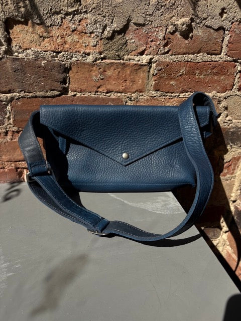 Introducing the Kim White Seam Out Fanny Pack in blue. Made with soft pebbled leather and featuring a large envelope-style design with a snap closure. The roomy exterior pocket is lined with suede and the high-quality metal zipper glides smoothly. Wear it around your waist, on your shoulder, or across your chest with the adjustable strap. Perfect for a chic and effortless look. Made in the USA.