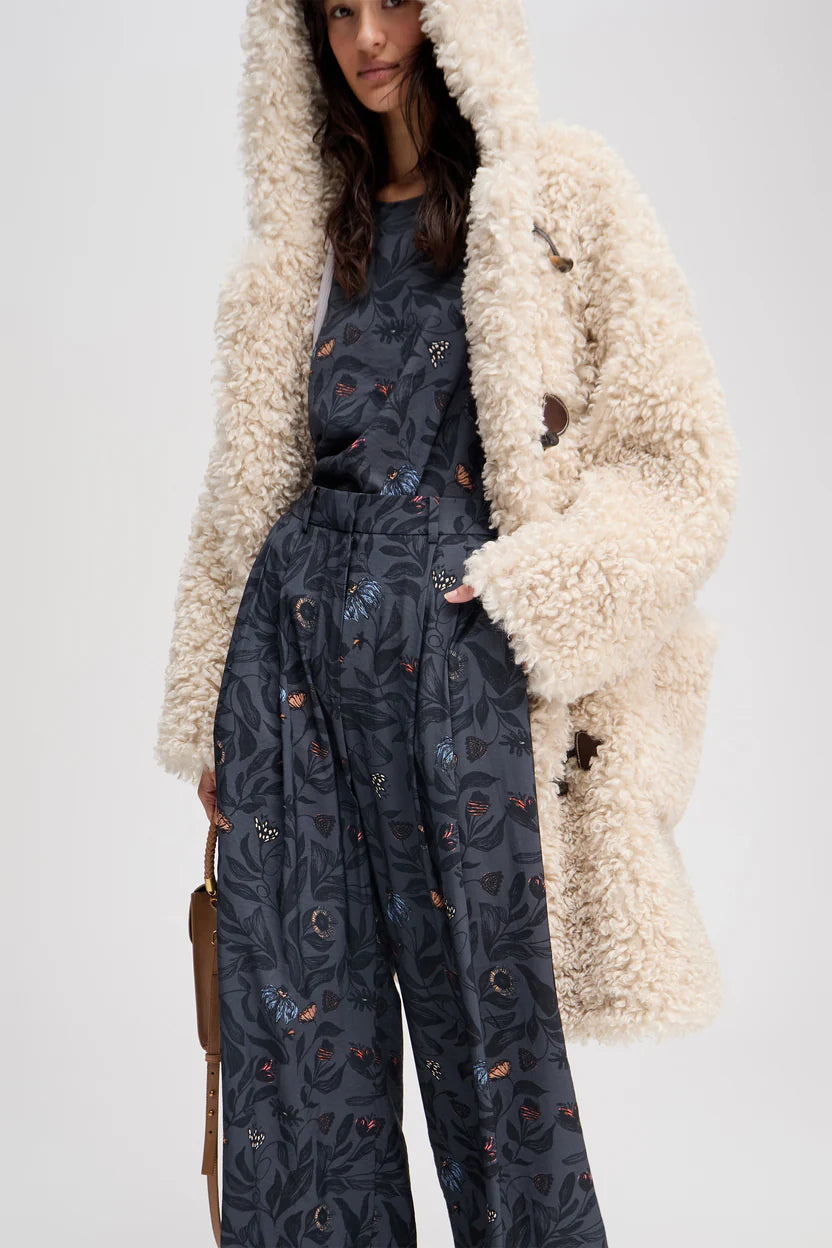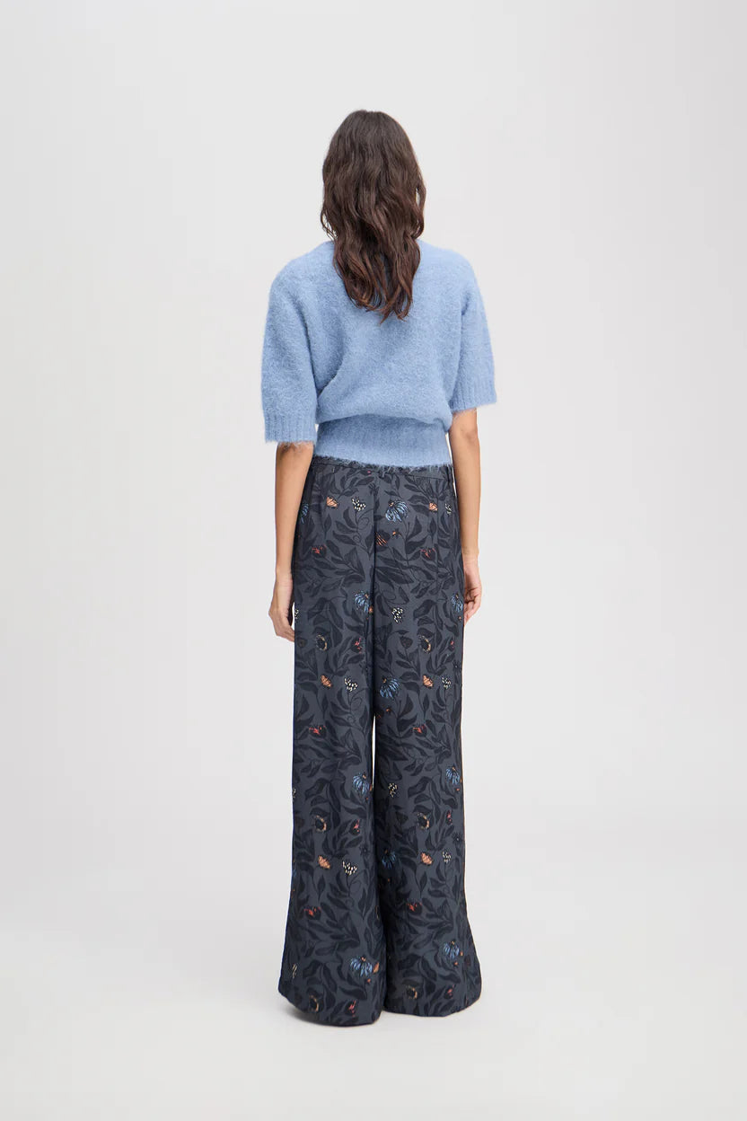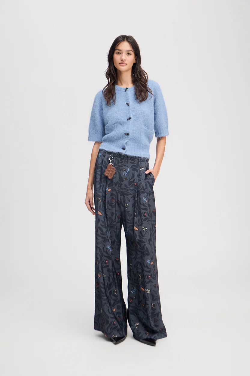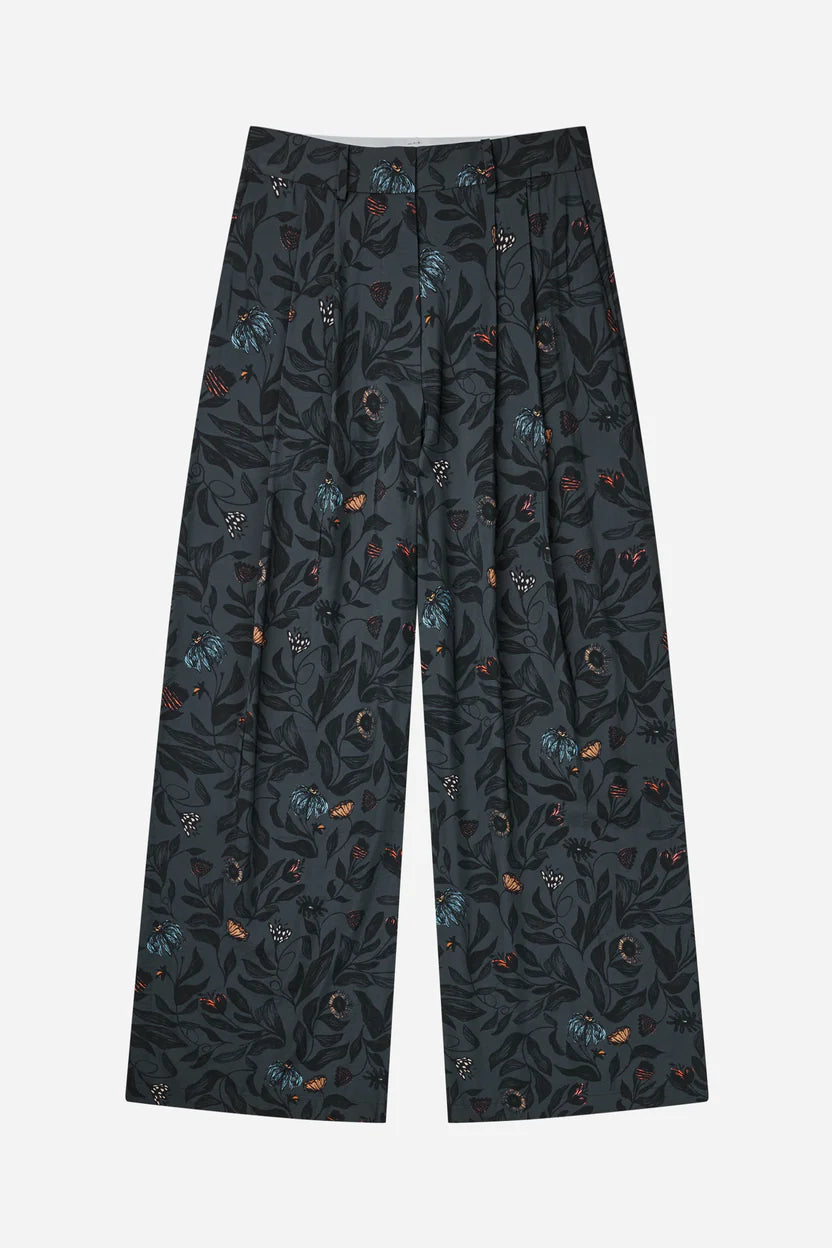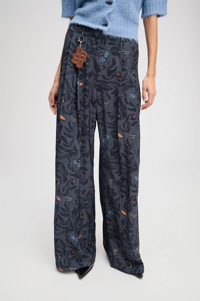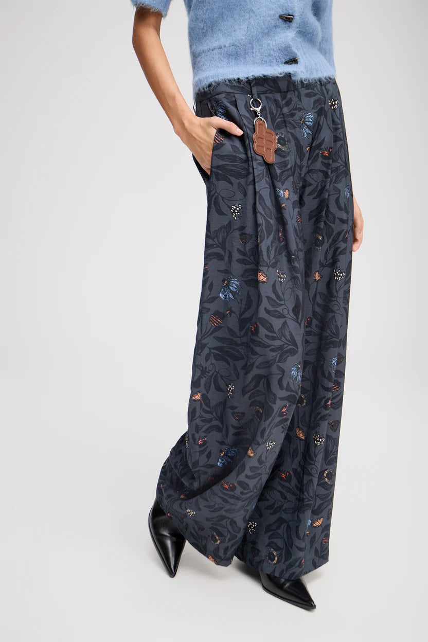 Trousers with a beautiful floral print, wide legs, and elegant details such as belt loops, pleats, and side pockets. The trousers have a zip closing.