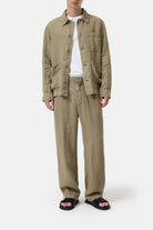 Introducing the Closed Atelier Jacket in Chino Green for men. This summer overshirt takes the lightness of a linen shirt and combines it with the functionality of a jacket. Made from a medium-weight, open-textured fabric, it's perfect for warmer days. With a utility-inspired design, including a shirt collar, large pockets, and horn-effect buttons, this jacket exudes sophistication and practicality. 100% linen with cotton lining