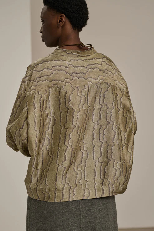Expertly constructed with a fairly loose fit and a moiré print, the Soeur Chypre Blouse is an elegant addition to your wardrobe. Crafted from 13 mm silk dupion, it features long and wide sleeves, a mandarin collar with buttons, and a button front opening. Complete with a patch pocket on the front for added functionality.