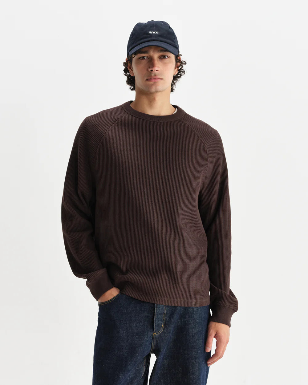 Elevate your fall wardrobe with the Wax London Men's Riley Crew in dark brown. Crafted from a rigid waffle fabric blend of cotton, polyester, and elastane, this piece offers both structure and subtle stretch for comfort. Its refined texture and rich hue make it a versatile choice for sophisticated seasonal layering.
