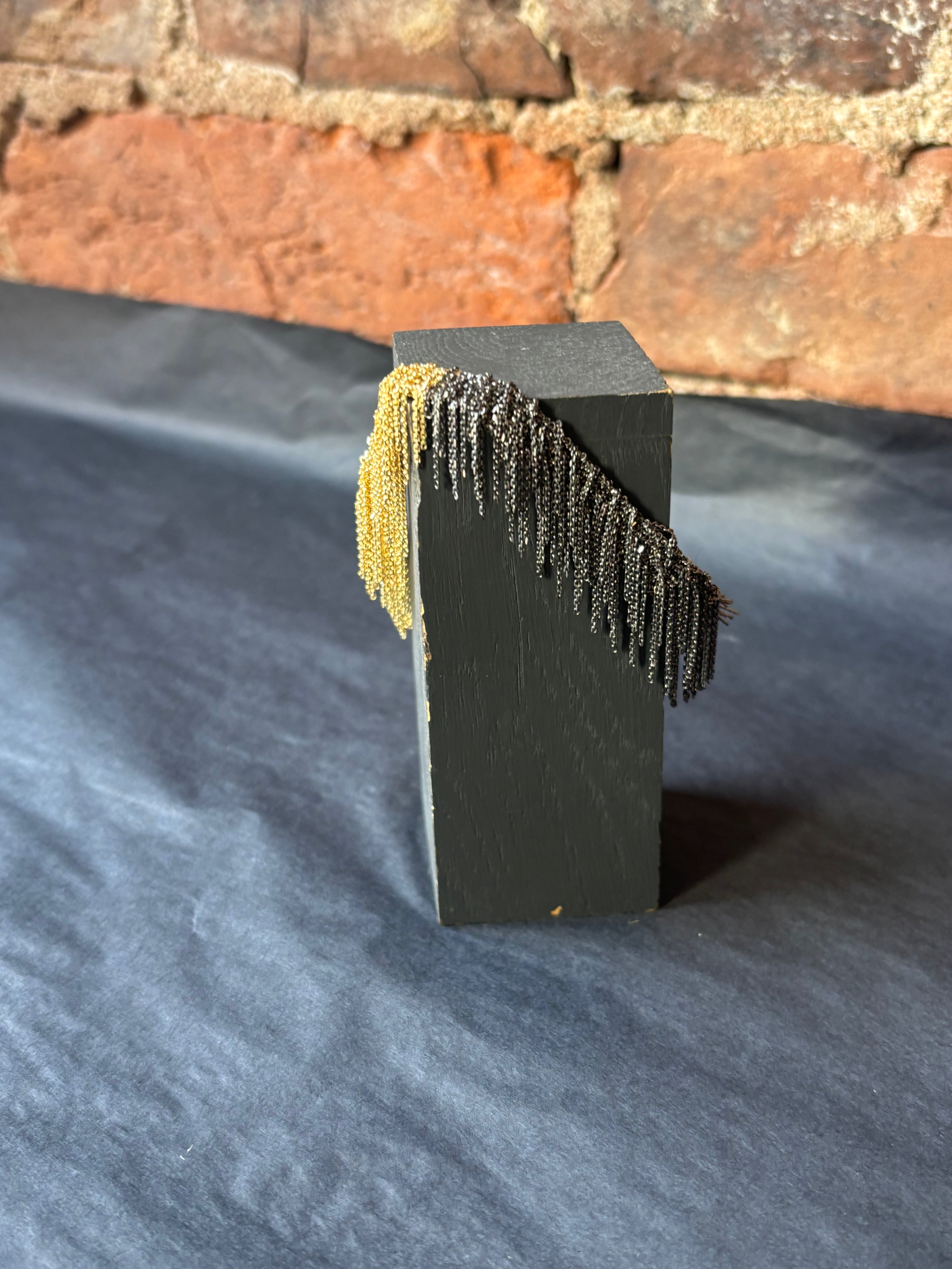 Simple, casual woven silk bracelet featuring duo-toned fringes made of sterling silver chains finished in 18k gold and ruthenium. The metal deep grey ruthenium color meeting the dazzling, lustrous gold gives this bracelet unique character you'll not find elsewhere!
