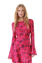 This Pink Floral Printed Satin Mini Dress features a round neckline and long sleeves.
