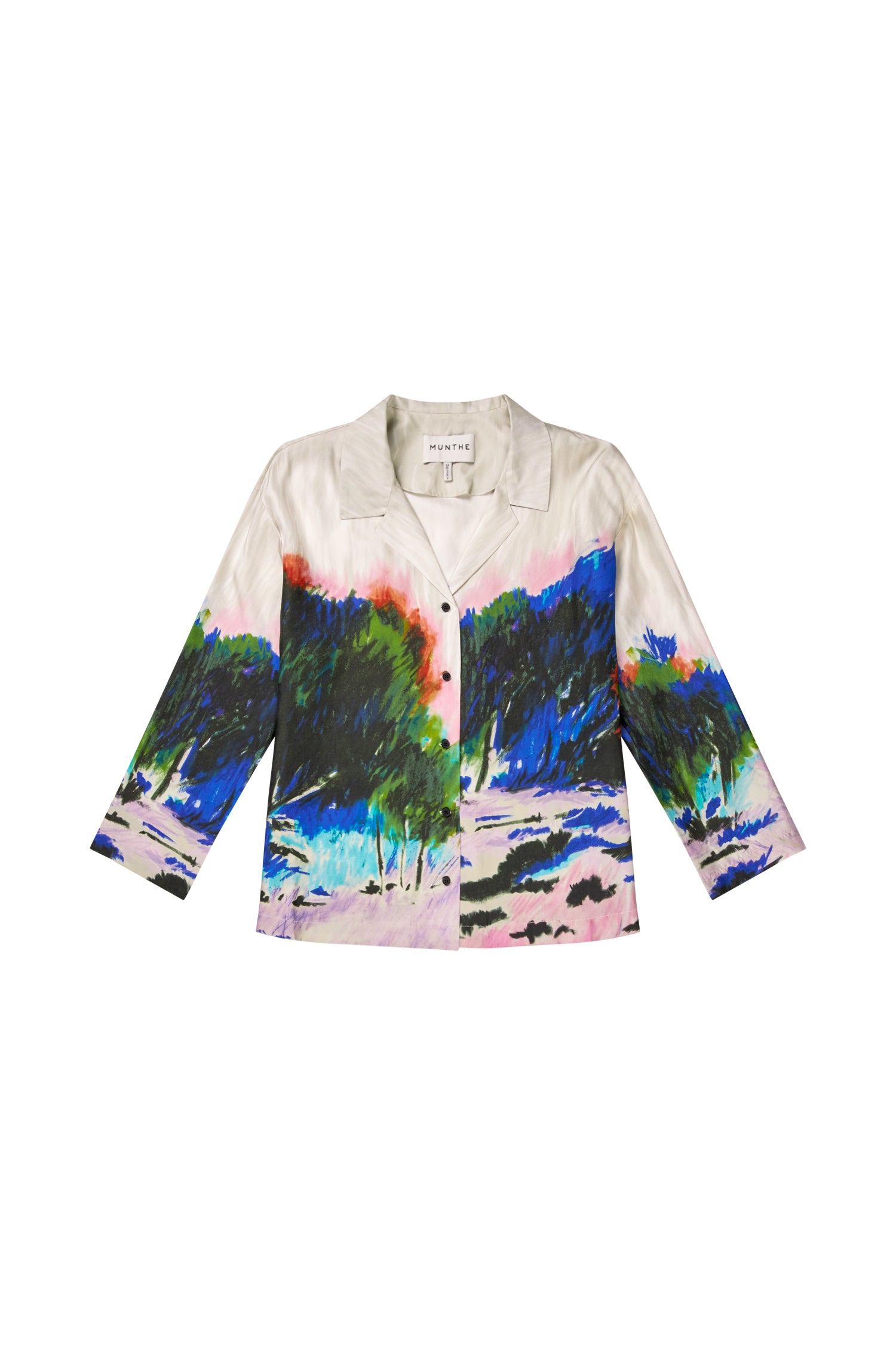Expertly crafted in a soft, luxurious silk fabric, the Munthe Sachu Jacket features a unique abstract nature print in vibrant shades of blue, green, orange, and pink. Its modern design includes a short collar and four-button closure, making it a versatile and stylish addition to any wardrobe.